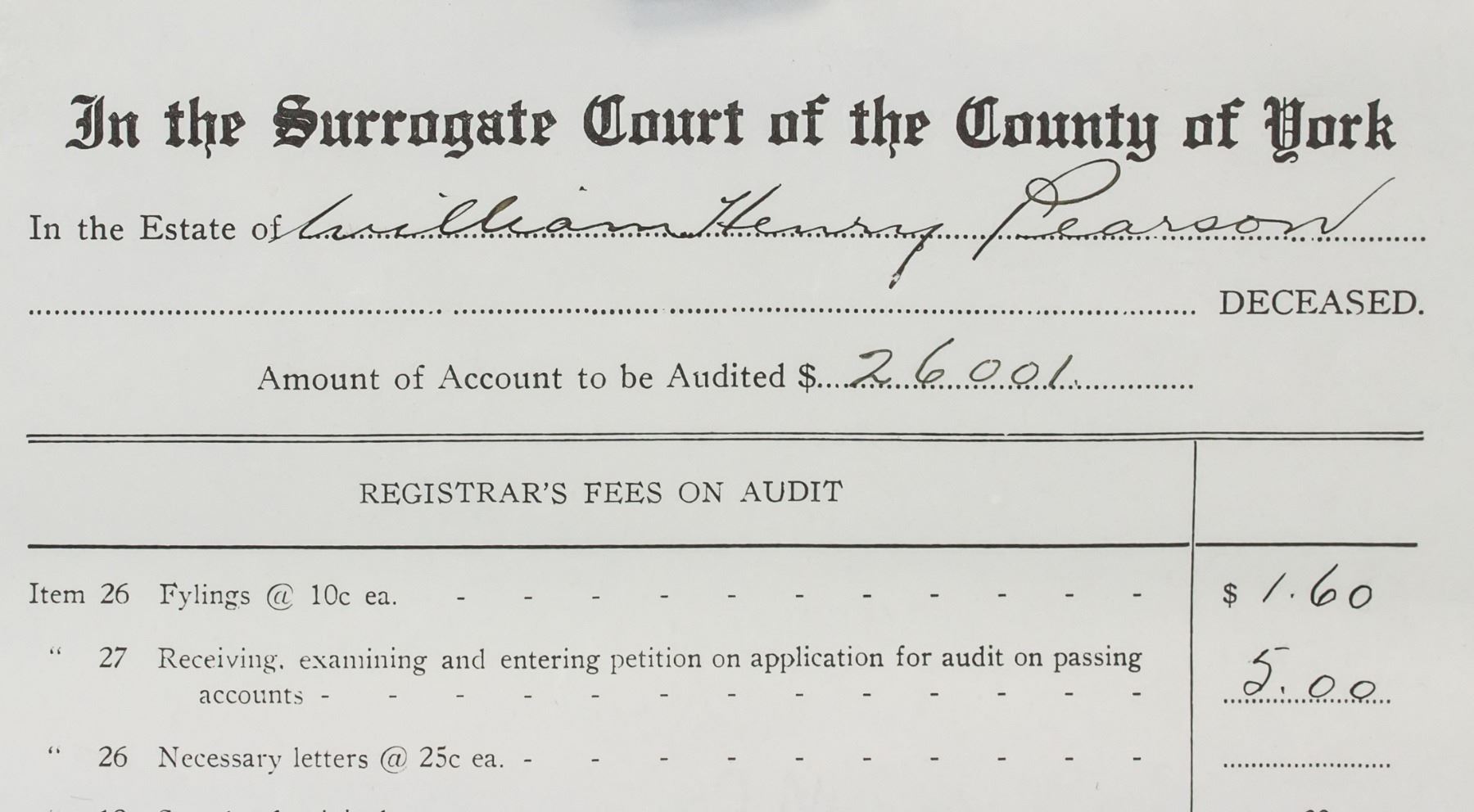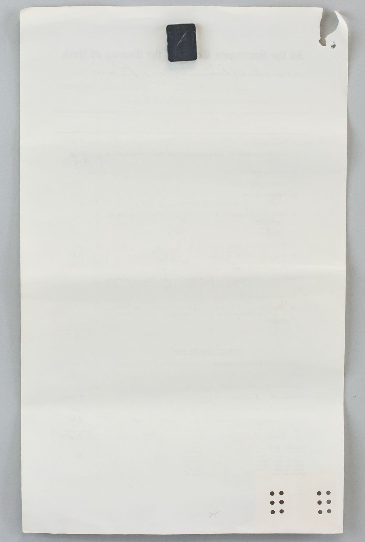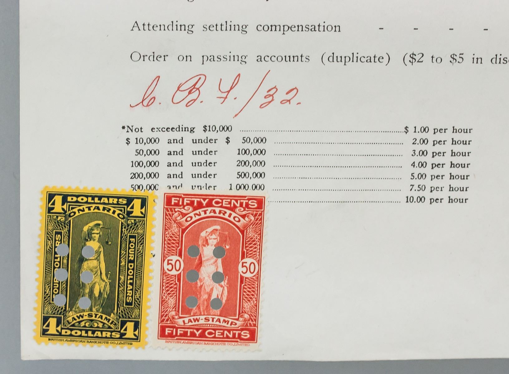 Two (2) assorted Ontario law stamps. One 4 Dollars and one 50 Cents. County of York court document. 35.5 x 21.5 cm, stamp size: 4 x 2.5 cm
