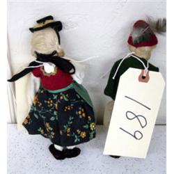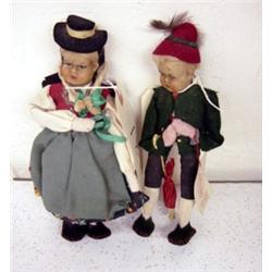 These dolls were made in Austria and are approximately 7 inches. The woman has long blond braids and is wearing a colorful green, black and maroon native outfit. The man also has blond hair and is wearing black knee pants, green jacket, white stockings and a maroon hat. He still has the original tag attached. They are in good condition.