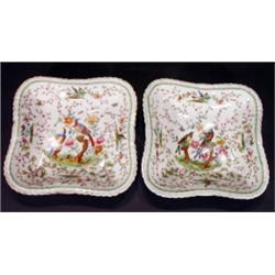 Two Austrian square porcelain plates, hand coloured and transfer printed with birds amongst flowers, marks to backs, 26cm in length