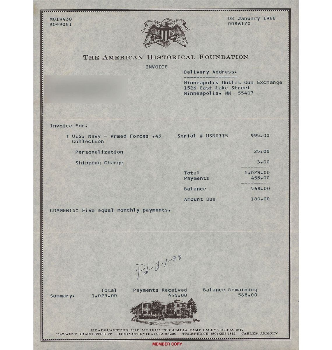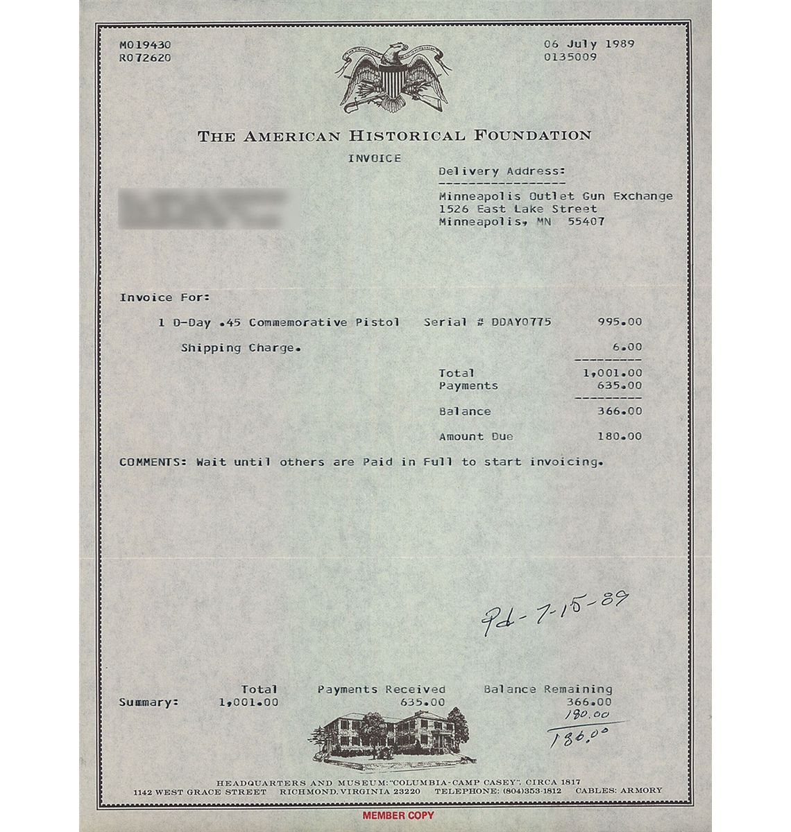Each purchaser at this auction grants us a security in the property purchased. We may retain as collateral security for the purchaser’s obligations to us any of the purchaser’s property and all monies held or received by us. We may apply against such obligations monies held or received by us for the account of, or owing to, the purchaser. We retain all rights of a secured party under the Illinois Commercial Code. Whenever the purchaser pays only a part of the total price for one or more lots purchased, we may apply such payments, at our sole discretion, to the lot or lots we choose. Payment will not be deemed made in full until we have collected all amounts due in cash on good funds (by our definition). If the conditions of sale are not complied with, in addition to remedies available to us and the consignor by law, we hold the purchaser liable for the purchase price, 15% buyers premium, and applicable sales tax, we at our option may either (1) cancel the sale, retain as liquidated damages all payments made by the purchaser or (2) resell the property either publicly or privately, and in such an event the purchaser shall be liable for the payment of any deficiency plus all costs and expenses of both sales and our commission at our standard rates. The purchaser is also responsible for all other charges due hereunder attorney’s fees and incidental damages, etc.