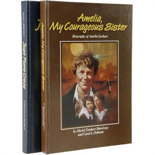 <B>Two Autographed Biographies of Early Female Aviators,</B></I> including:<BR><B>Muriel Earhart Morrissey and Carol L. Osborne: <I>Amelia, My Courageous Sister</B></I></B></I> (Santa Clara, California: Osborne Publisher, Incorporated, 1987), first edition, 312 pages, illustrated institutional binding, 4to (7.5" x 10.5"). Illustrated endpapers. Signed "<I>Muriel Earhart Morrissey</B></I>" on the front free endpaper.<BR><B>Donna Veca and Skip Mazzio: <I>Just Plane Crazy</B></I></B></I> (Santa Clara, California: Osborne Publisher, Incorporated, 1987), first edition, 314 pages, illustrated institutional binding, 4to (7.5" x 10.5"). Illustrated endpapers. Signed "<I>Bobbi Trout</B></I>" on the front pastedown. Both books in very good condition. <I>From the collection of Cliff Henderson.</B></I><BR><BR><b>Shipping:</b> Books & Catalogs (<a target="_blank" href="http://www.heritageauctions.com/common/shipping.php">view shipping information</a>)