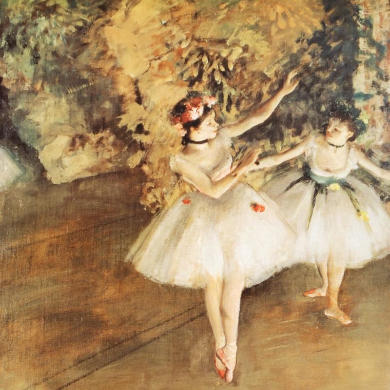 "Two Ballerinas" fine art print by Degas (1834-1917), created with EncreLuxe printing process which captures the subtle nuance of color from the artist's palette! 26" x 33" (with border); 20" x 27" (image).