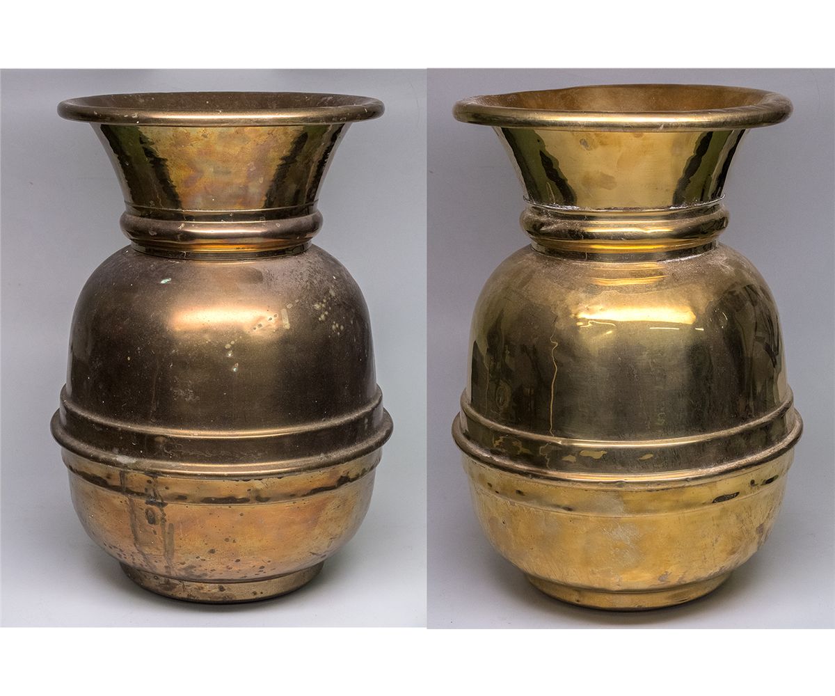 c1930 This lot contains two brass spittoons that, according to a photograph brochure, were in the main lobby at the First National Bank of Reno, Nevada owned by Reno banker Gordon Harris. Each stands 12” tall and is about 9” around the middle. Both are weighted at the base to avoid any accidents. These are both very handsome and historic items. Great history of Reno. Gordon Harris Estate - HKA#65635