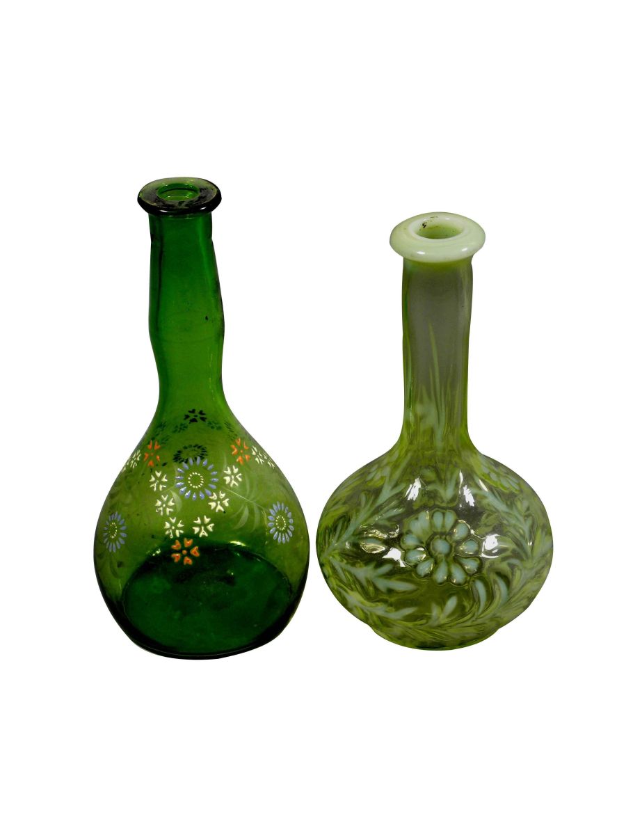 Lot of Two Barber Bottles including enameled flowers on green glass and floral Vaseline glass. No chips or cracks, excellent condition. 8 & 7 1/4 inches tall.