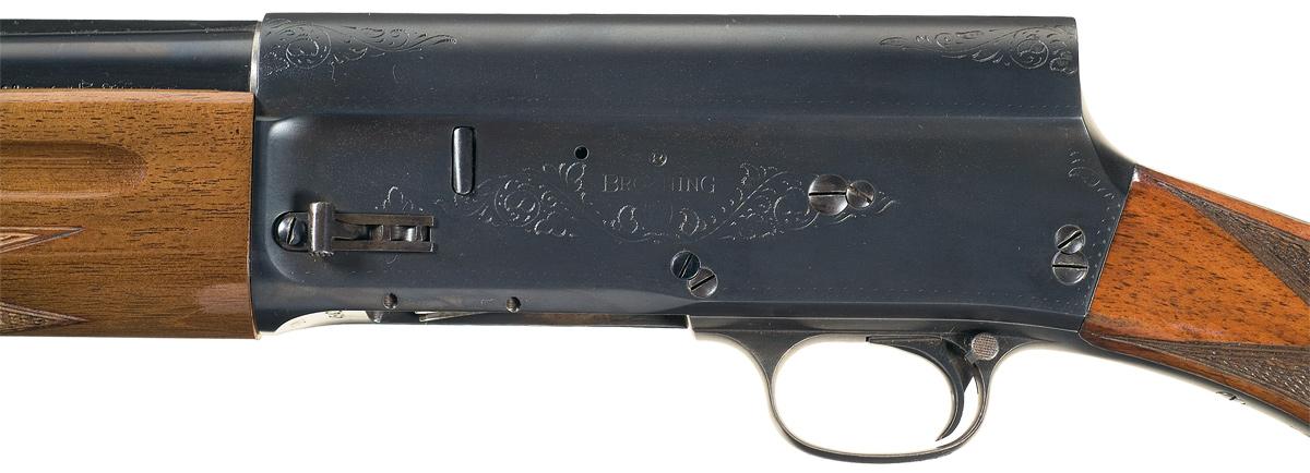 Manufactured in Belgium circa 1958. This Auto 5 shotgun consists of two 12 gauge barrels. The 25 5/8" solid rib barrel has a chamber marked 2 3/4" and choked marked modified. The 29 3/4" solid rib barrel has a chamber marked 2 3/3" and chocked marked full. Each barrel has a single bead front sight and has Belgian proofs. Slight floral scroll engraved receiver with blued trigger. Checkered forearm and round knob pistol grip stock with FN horn buttplate. Complete with a Browning takedown case.
