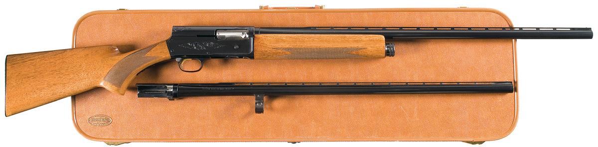 Manufactured in Belgium with two 20 gauge barrels. Both barrels feature a bead front sight on a matte vent rib with 3 inch chambers. One barrel is marked choked modified, the other full. The action and trigger guard are lightly floral scroll engraved with a zigzag border. Lower tang also features an engraved leaf. The left side of the receiver is marked "Magnum Twenty". Checkered forearm and pistol grip stock with FN buttplate. Length of pull is 14 1/4". Complete with Browning takedown case.