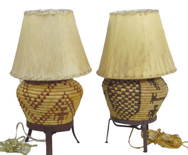 Early 2000s, Pair of southwest design basketry ollas made into lamps - with rawhide shades. Bases 17" x 8", shades 8" x 9"