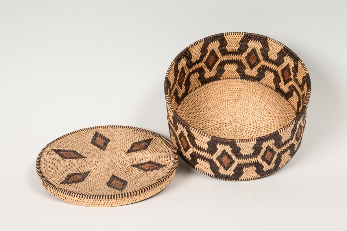 Two Baskets: 1) Unknown Basket, maybe foreign. 2 ½" x 5 ¼". 2) California Lidded Basket. 3 ¾" x 7 ¼". Polychrome design. Circa 1930.