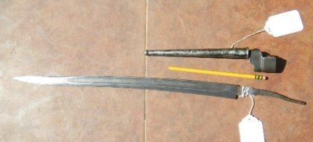 Two Bayonets. One is Victorian Bayonet Blade 25 x1 inch and other is a bayonets with scabbard 10 one half inch for a British End Field Rifle. Shipping $18.00 Condition Fair