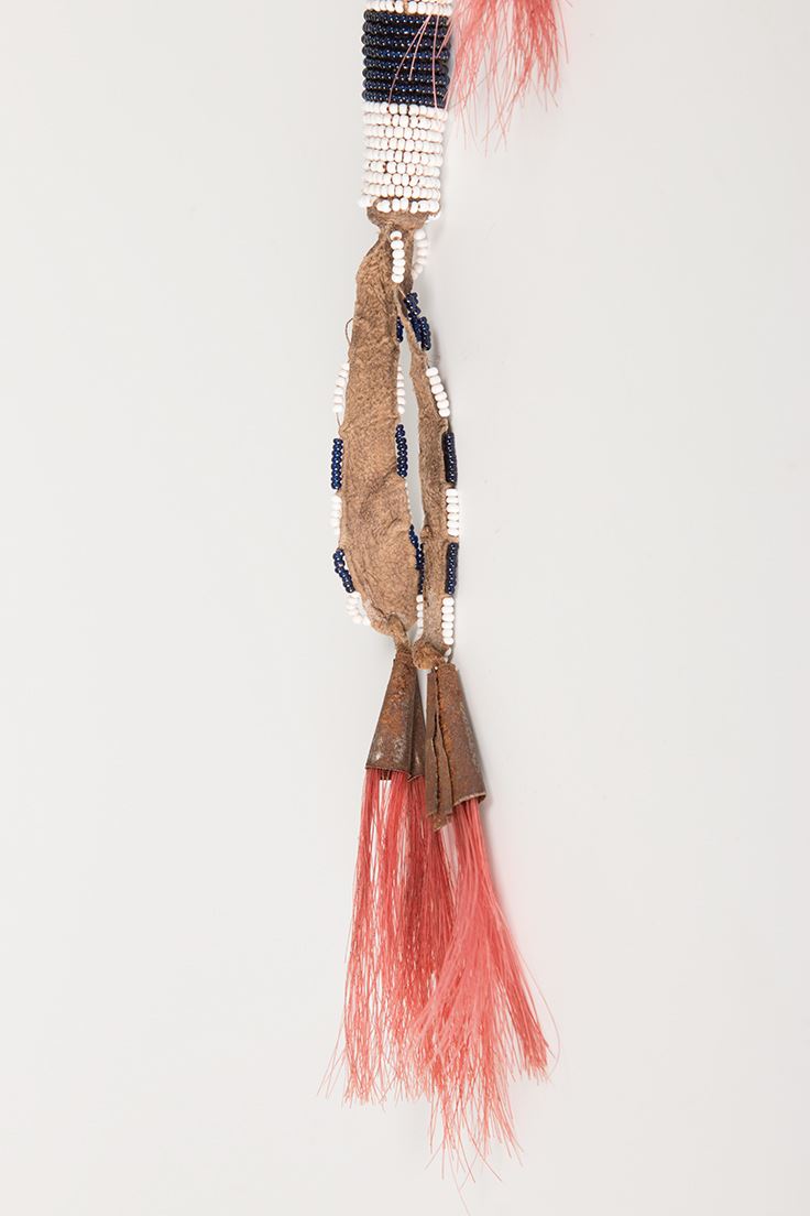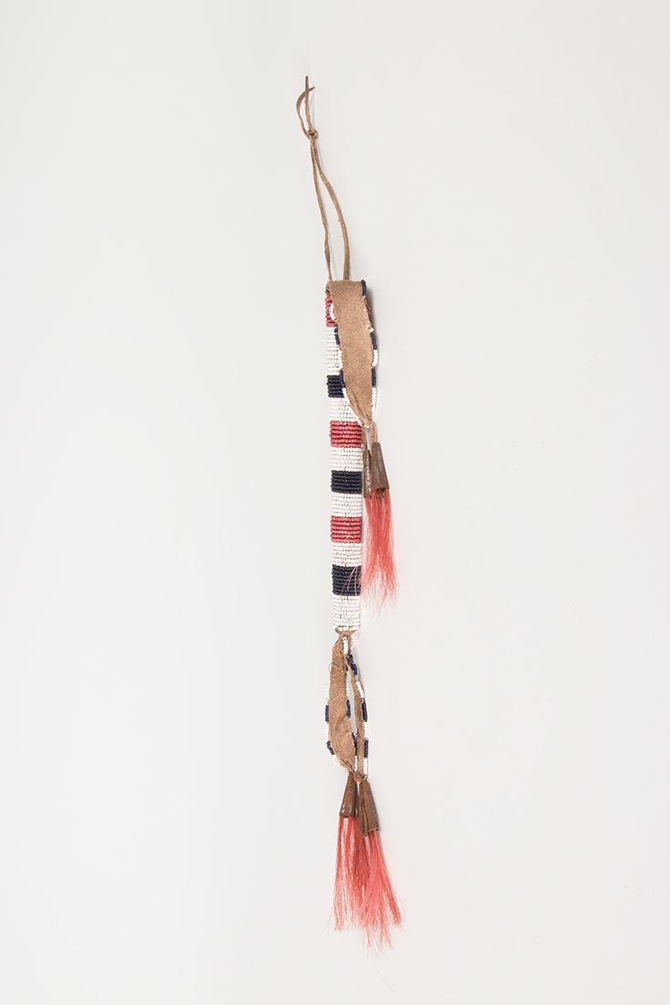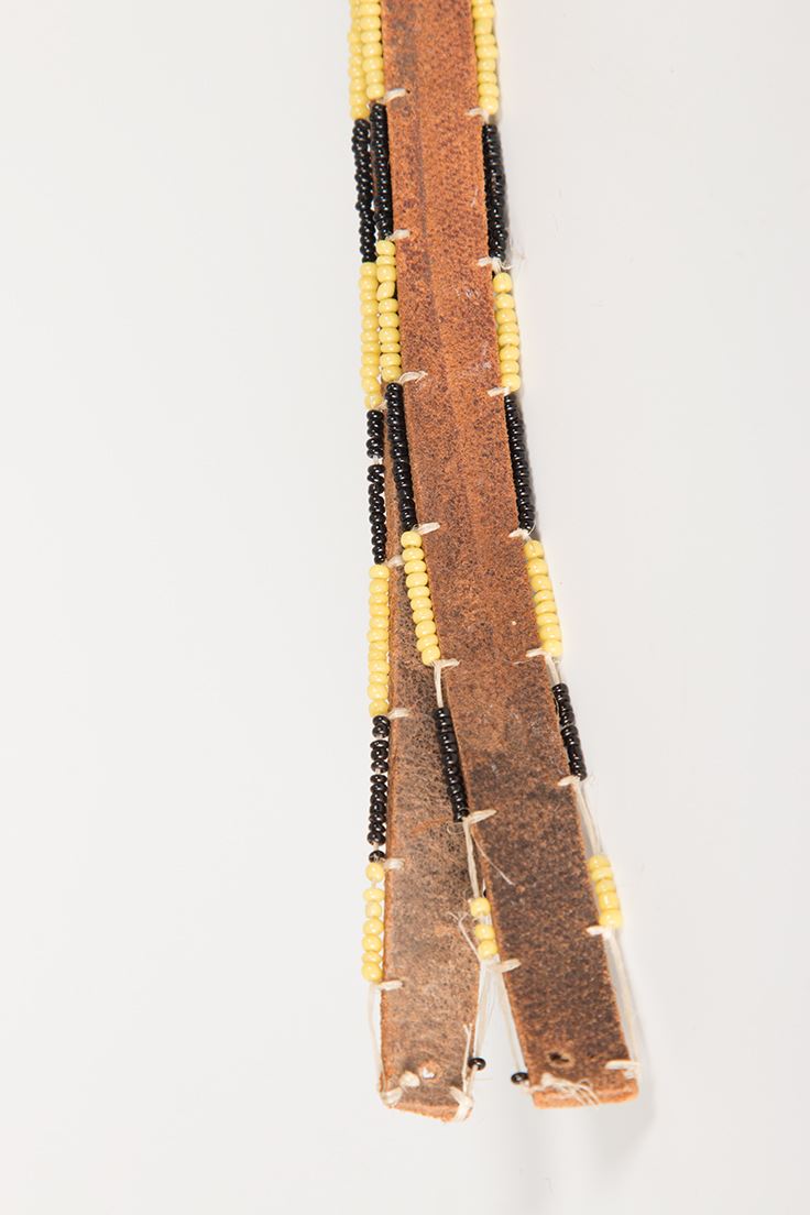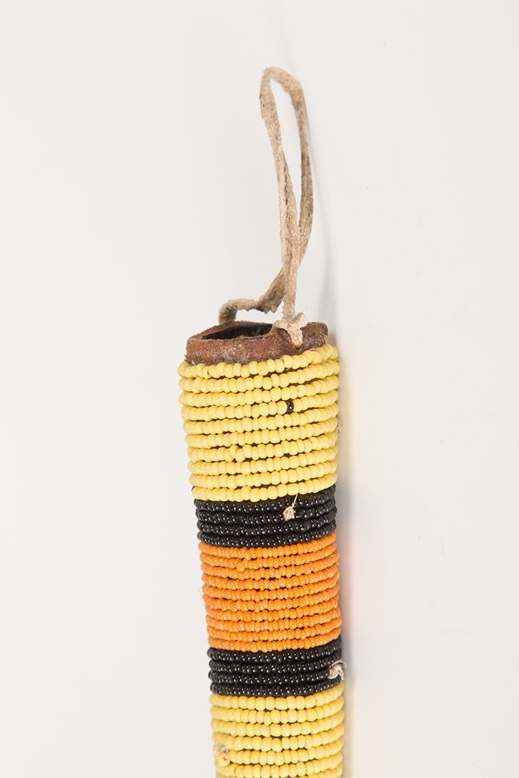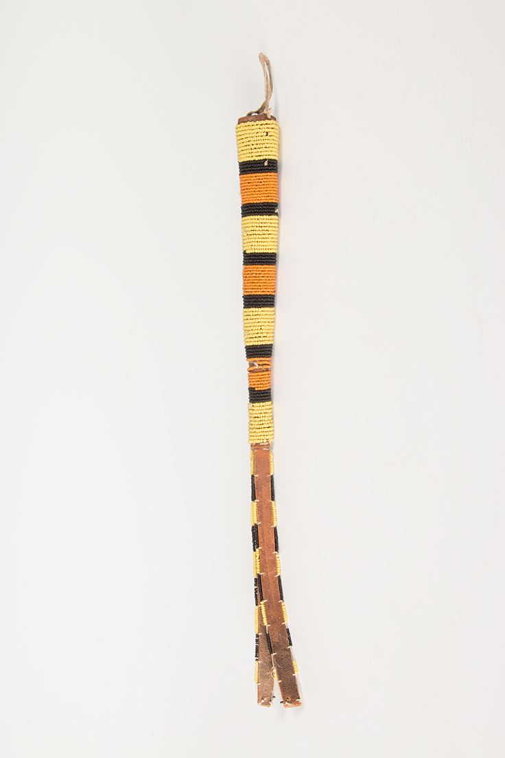 Two Beaded Awl Cases. 1) 19" overall. Black, white and red beads. Two 3" drops are edge-beaded, terminating in tin cones stuffed with horsehair. No awl. 2) 13 ¾" overall. Yellow, black and orange beads. Two 6" leather drops are edge-beaded. No awl.