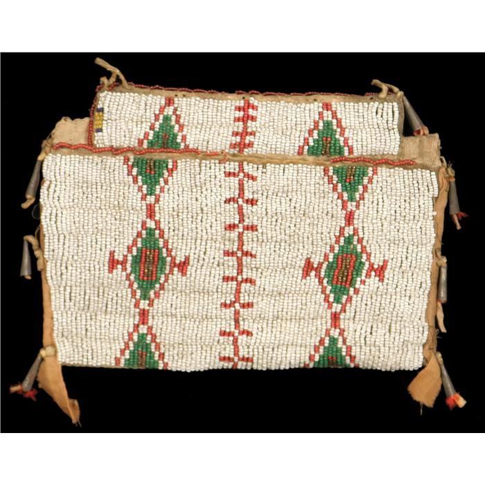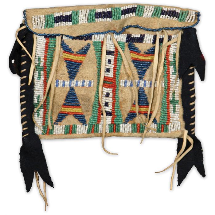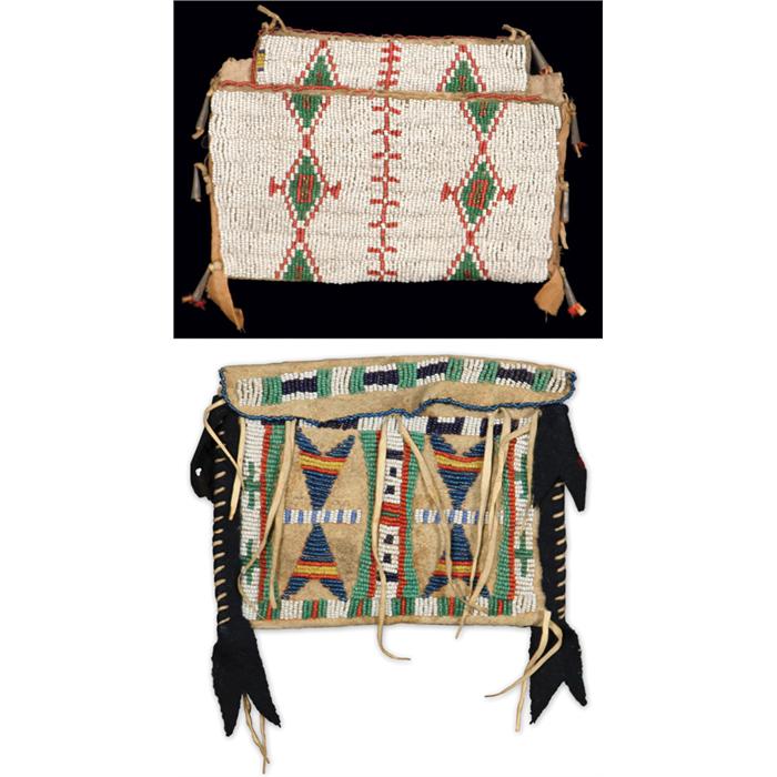 Two Beaded Bags. (1) Sioux Beaded Bag, Parfleche back. 5" x 7 1/2". C. 1890. (2) Blackfoot Beaded Bag, Cloth accents. 5" x 7 1/2". C. 1900. (est $600-800)