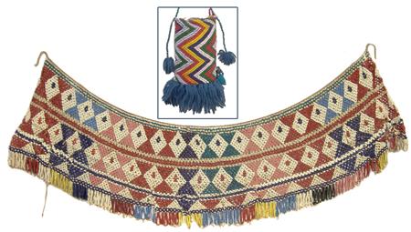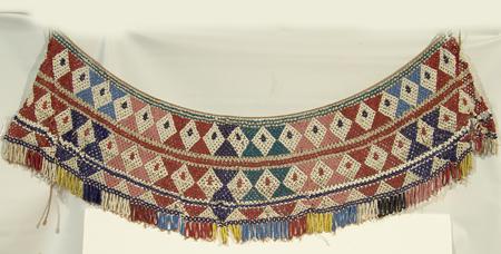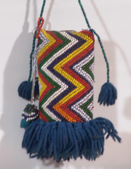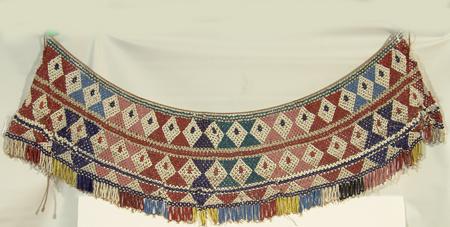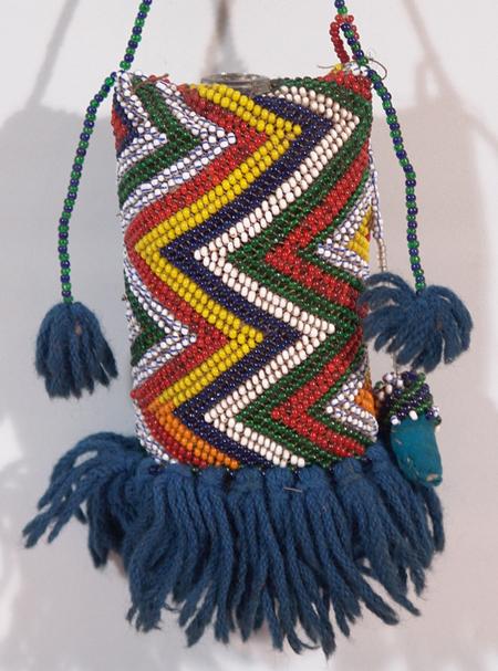 A colorful open beaded apron plus a fully beaded liquor flask with wool tufts. Appraisal value $1,100. 10" x 36" and 3" x 5"
