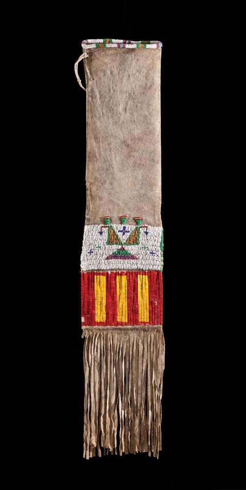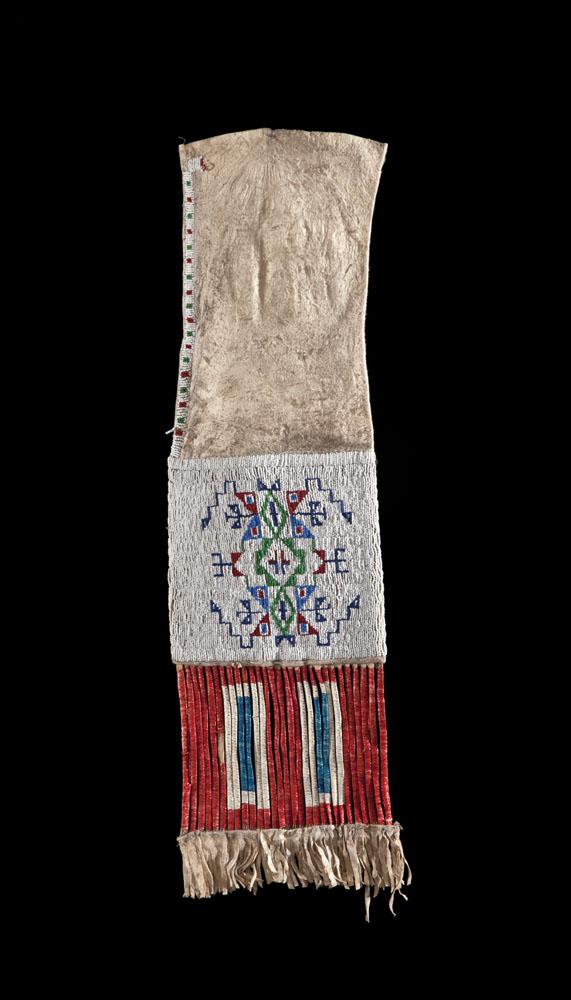 a) 37”x 7” multicolored geometric designs on native tanned hide with red and yellow quill slats and 12” fringe. Good condition with some restoration, c. 1900. b) Unfinished bag with short fringe and “storm pattern" design, c. 1920s.