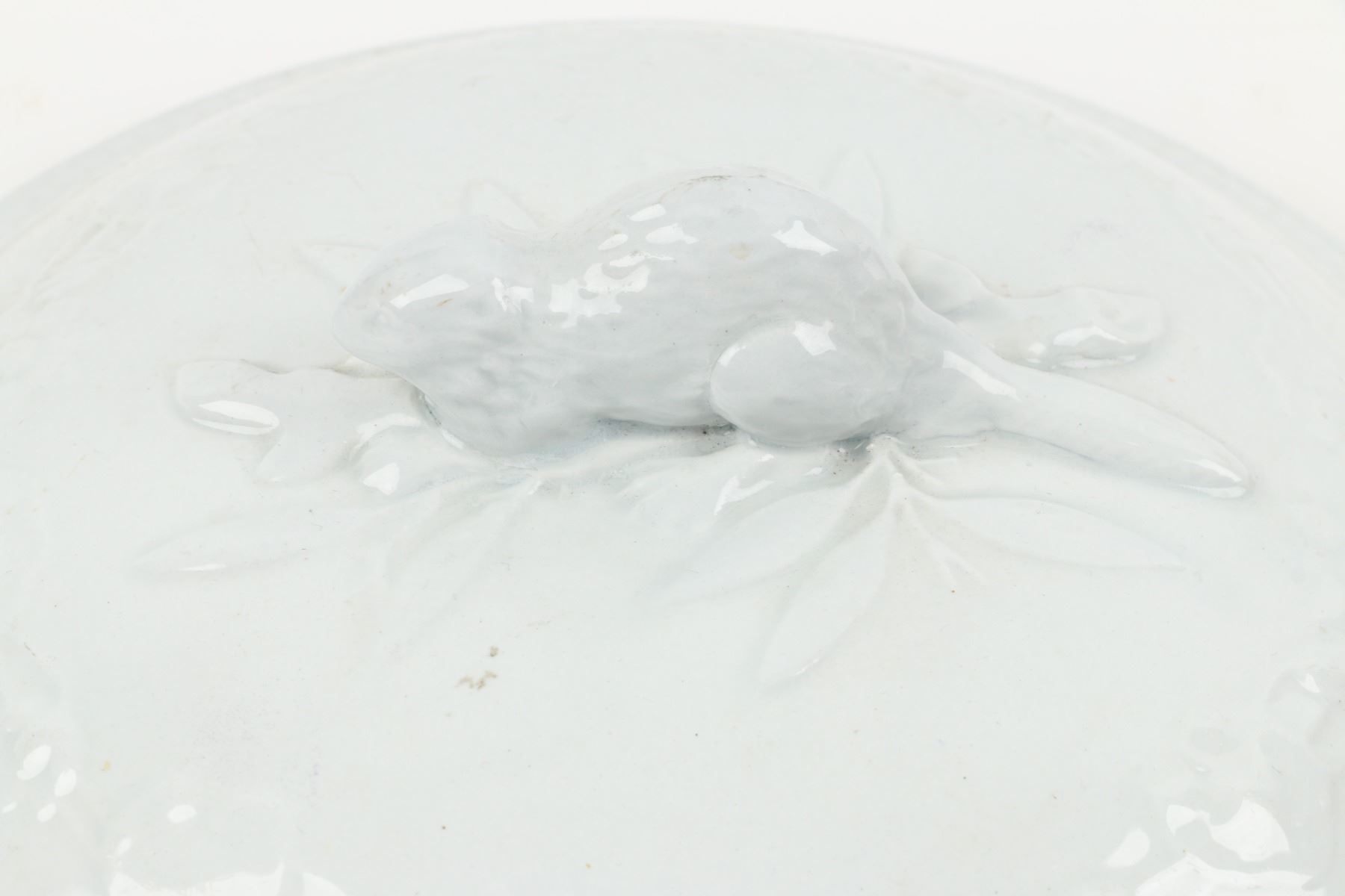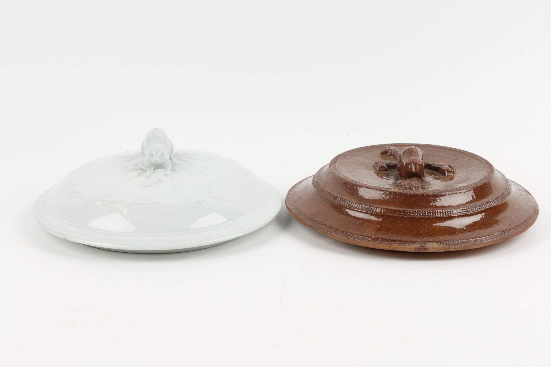 Ironstone chamber pot lid, redware pot or crock lid, both 9" diameters. Condition: Ironstone excellent, very white glaze, edge with three very small firing flaws/abrasions, one under beaver hind quarter right side; redware with 3.5" long hairline, underside edge 1" flat chip, tiny ear glaze flake