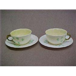 Two Belleek Shamrock Ware teacups and saucers, 5th mark