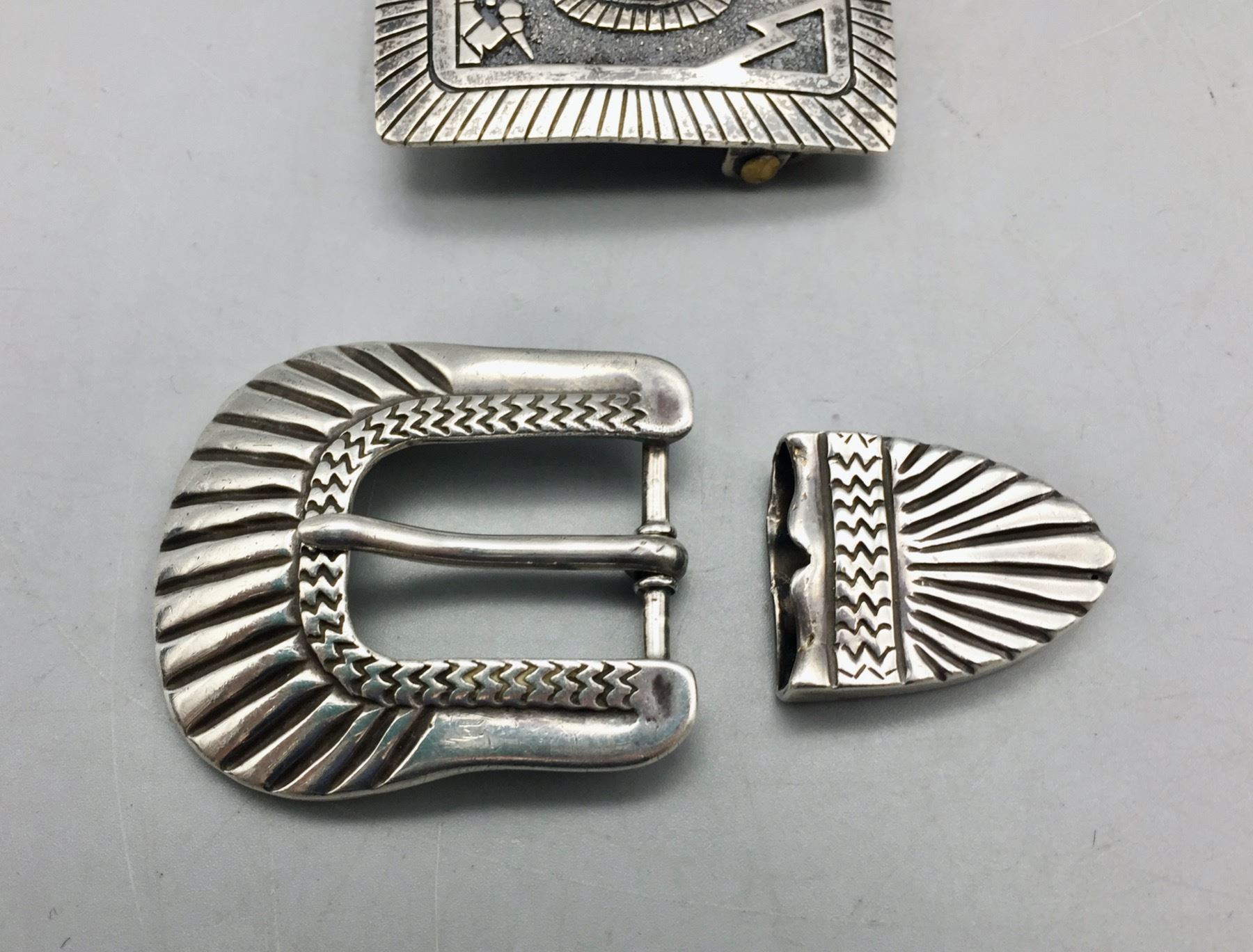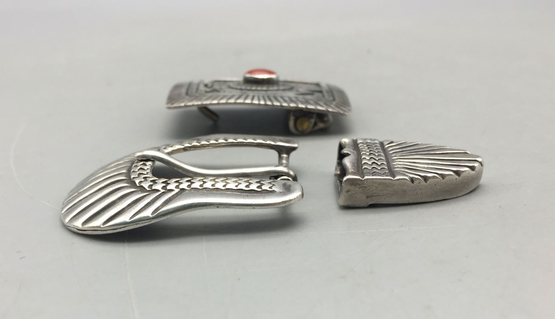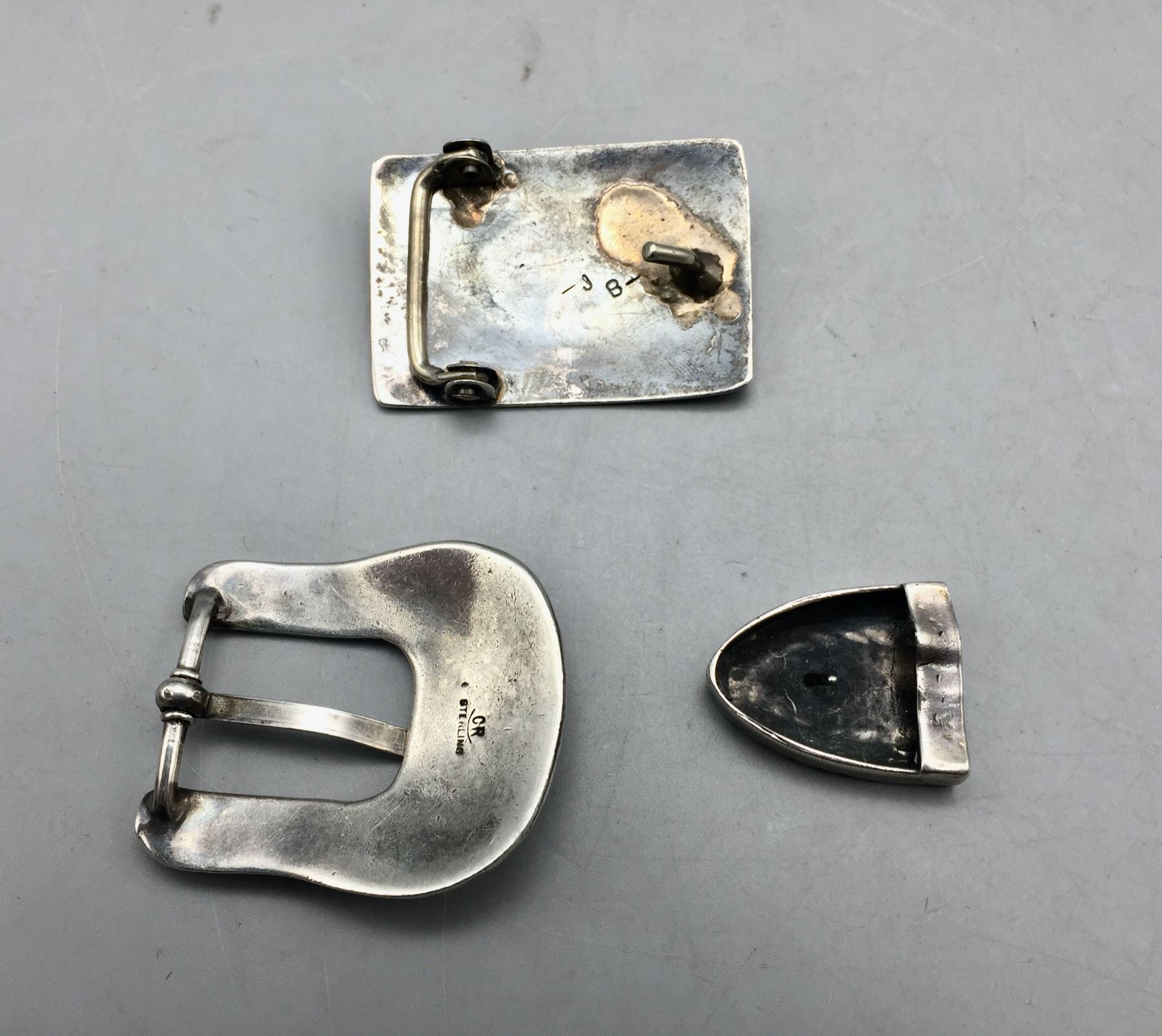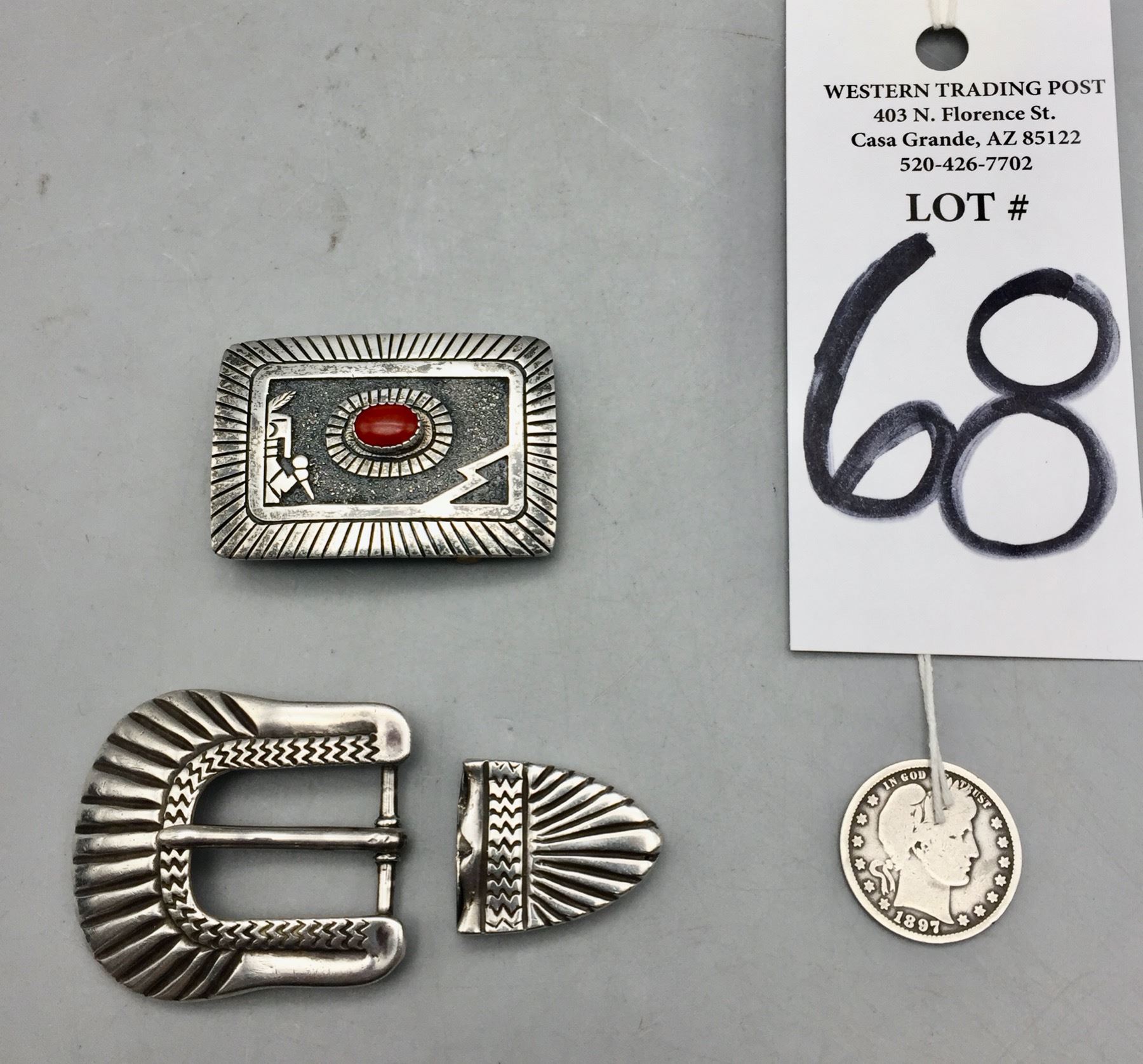 Description: Presented for sale in this lot are two nice little sterling silver belt buckles. One is a ranger style with a matching tip and the other is the traditional rectangular style with a coral cabochon set on it. Maker: Both are hallmarked with initials and stamped as sterling. Approx. Age: Contemporary. Size: Various. Combined 50.7 grams. Condition: Good for their ages, minor wear expected. Please look closely at the pictures - they are an important part of our description. Shipping: There will be a $5 handling, packaging fee for shipping this lot. The actual cost of postage will be added on top of that.
