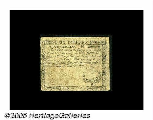 <B>Two Better Types.</B></I> A February 17, 1776 $1/3 Continental <B>Extremely Fine</B></I> and an October 19, 1776 $6 South Carolina grading <B>Very Fine</B></I> with one small hole.