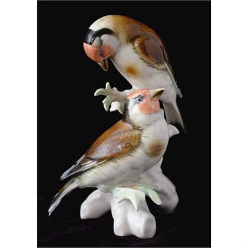 Porcelain figurine of two birds standing on a branch. It is signed on the underside with what appears to be the green Karl Ens mark used before World War II (it was later changed to blue). Karl Ens was a German porcelain manufacturer famous for its fine, handmade porcelain birds. In good used condition with restoration and imperfections from the time of manufacture, as shown. Please ask questions, request additional photos and shipping costs before buying.