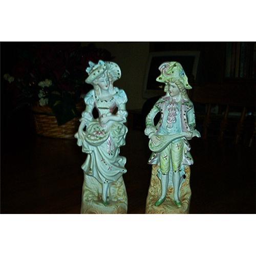 Featuring two, vintage, victorian, bisque, figurines. Man and woman. Both measures 8 3/4 inches tall; The bases measures 2 1/2 inches long by 2 1/4 inches wide. Bottom of each, stamped in Red: Copyright E.S.M., Inc. Two very delicate, bisque, victorian figurines. Colors are pastel: Yellow, pink blue, green and browns. Both are in excellent condition.