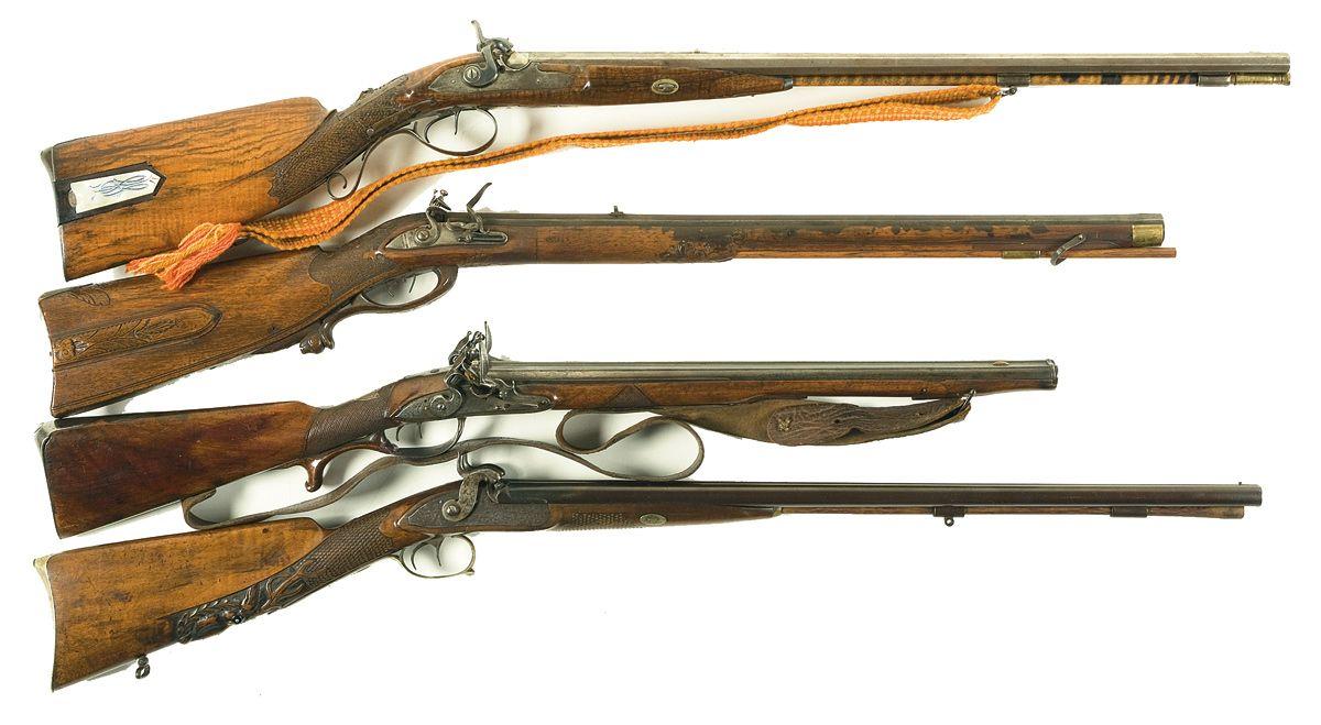 A) Blade and notch sights, Stuttgart address on rib, bolster-style nipples with flash shields, broken tang sight base, repaired stock, brass banded wrist and patch box with monogrammed mother of pearl panel on the lid.