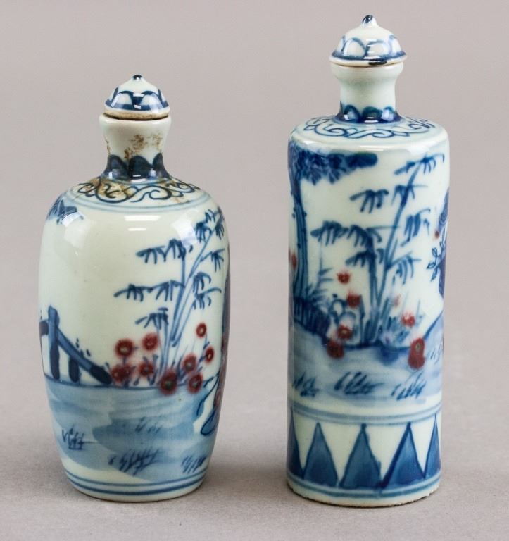 Lot of two (2) Chinese blue and white copper red snuff bottles. Featuring Immortal figural scene with stoppers. Marked on base with Artemesia leaf mark. Height: 10 cm. Diameter: 3 cm. Height: 9 cm. Diameter: 4 cm. 118 grams (total)