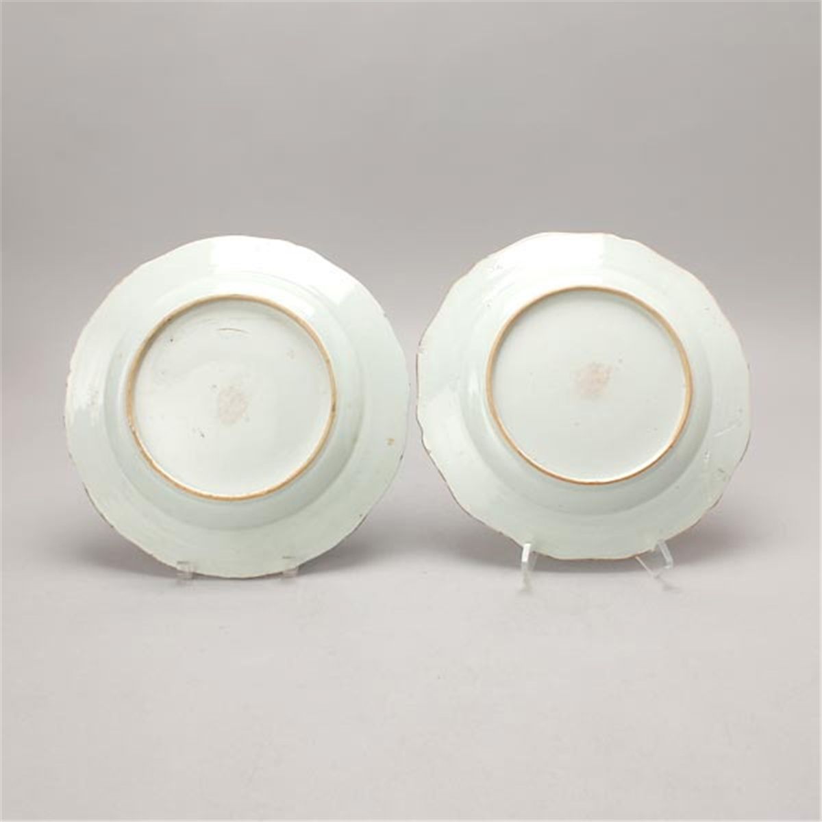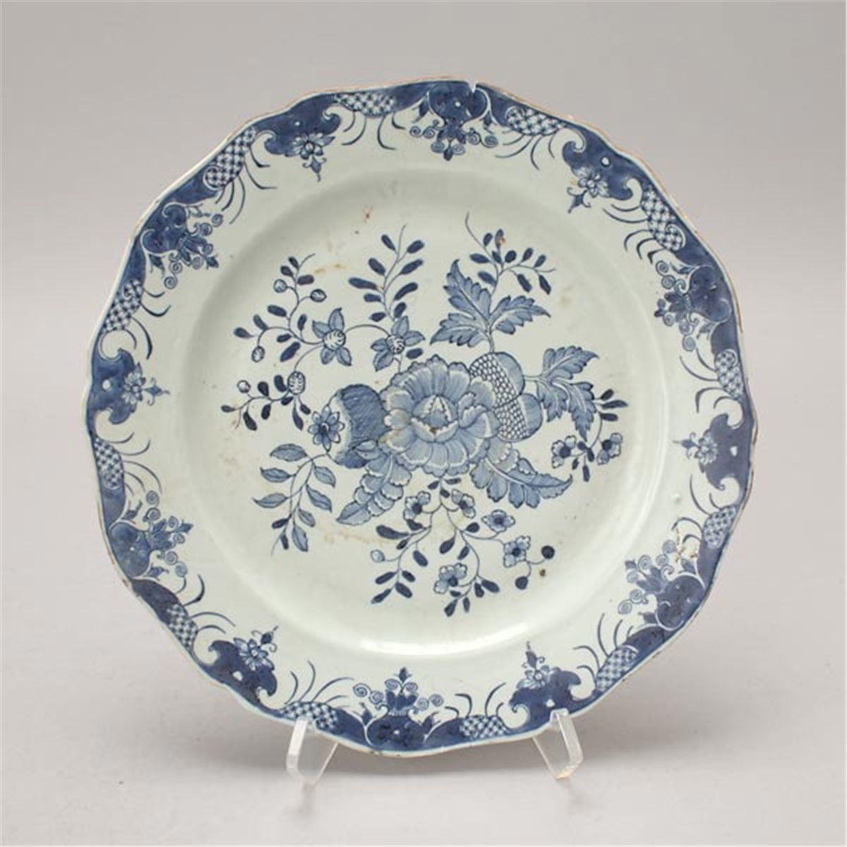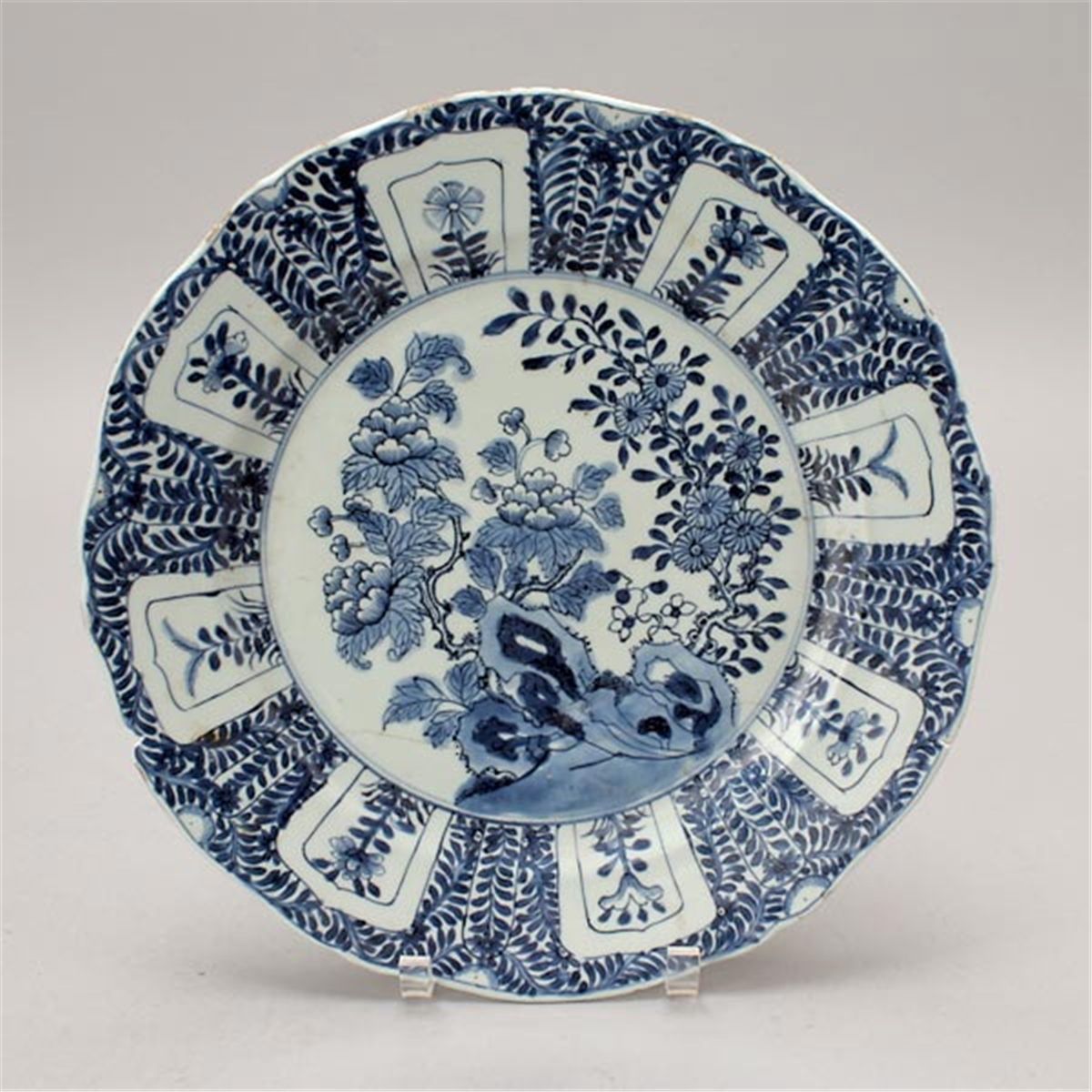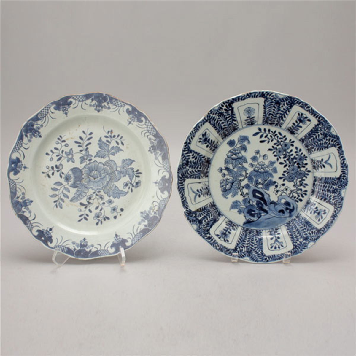 Two Blue and White Porcelain Plates, 17th/18th Century, both decorated to the floor with large leafy peonies and chrysanthemums, encircled by stylized floral bands {Diameter of Largest: 13 1/8 inches (33.3 cm)} [Cracks, chips, repaired]