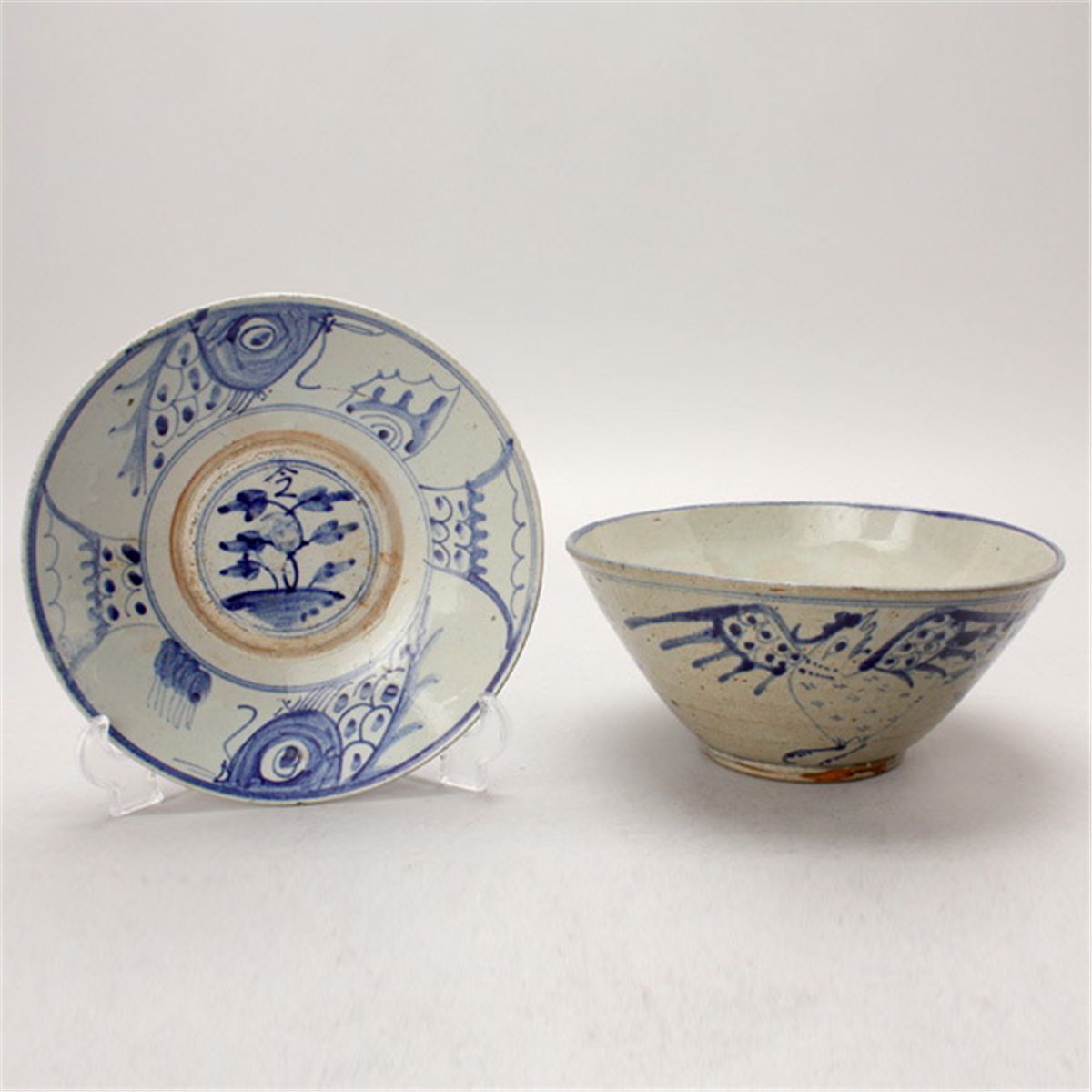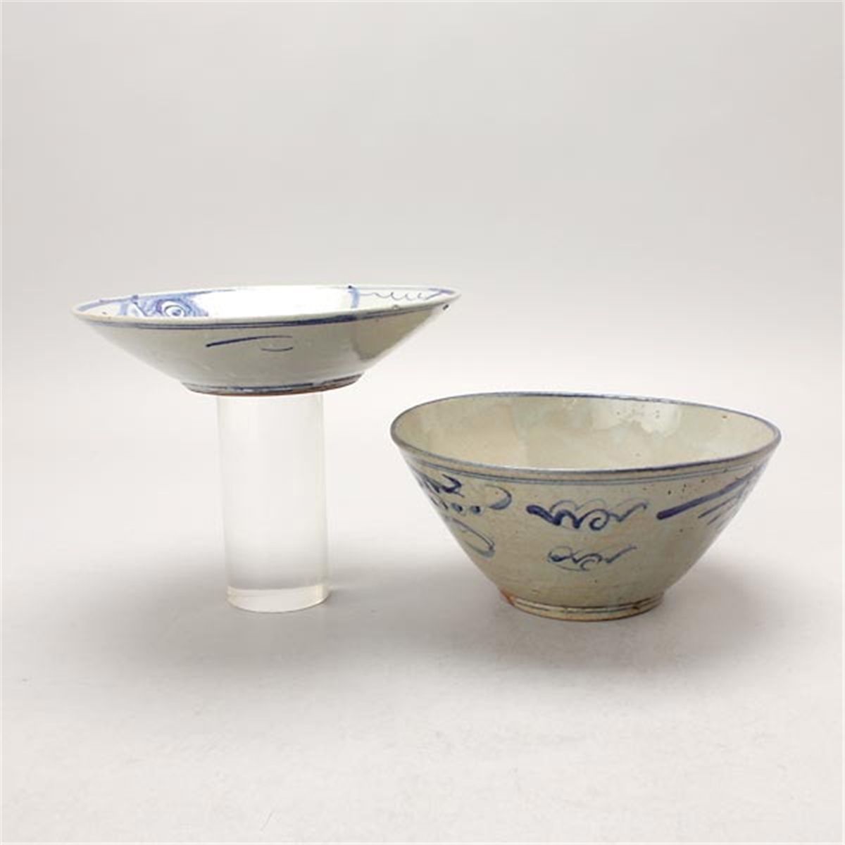 Two Blue and White Porcelain Wares, the first a bowl, the second a dish, both with abstract pattern and animal design {Tallest: 4 3/8 inches (11.1 cm)} [Unglazed surrounding the inner base]