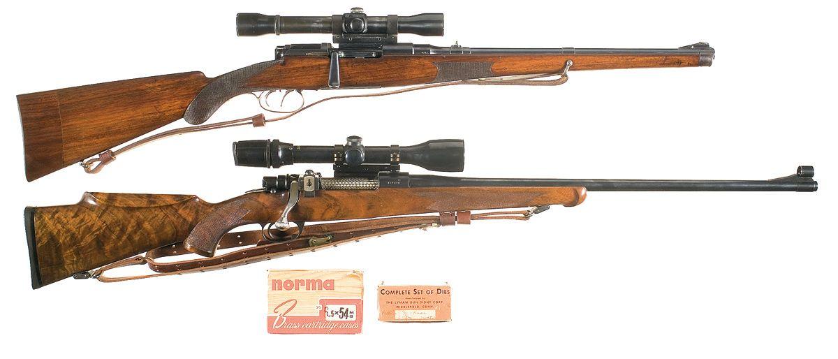 A) Standard markings and German proofs on barrel and receiver with buttstock extension. Complete with leather sling, Echo side receiver scope mount, Weaver scope and two plastic lens covers. Also, a complete set of dies by Lyman.