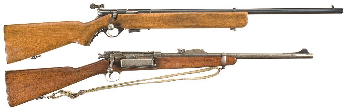 A) Standard markings with "U.S. Property" on top receiver with Mossberg Microclick S-100 adjustable rear peep sight. Complete with finger rest and detachable magazine.