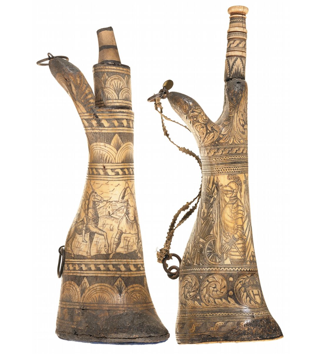 1) Carved bone powder flask, measuring 12 1/2 inches tall. Brown painted bands are present on the spout, with a pair of iron hanging rings, geometric carving on the top and bottom thirds, and a panoramic scene of the closing moments of a boar hunt around the center. The flat base is blue felt upholstered. 2) Carved bone powder flask, 14 inches tall with a carved horn spot, golden wire hanger on iron rings, scroll and geometric pattern carving at the top and bottom with a grotesque face near the top ring and an array of arms and flags around the center. The base is zig-zag border engraved, with additional arms in the center. Provenance: The William Ashby Collection
