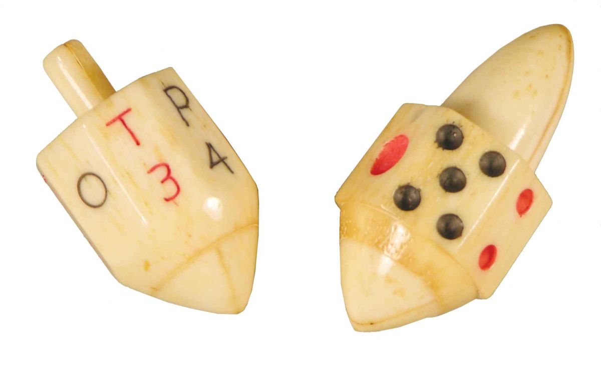 Two Bone Put-N-Take Tops or Spinners. Put-N-Take was a popular game from 1915 to 1940. Excellent condition. Largest measures 1 3/4 inches long.