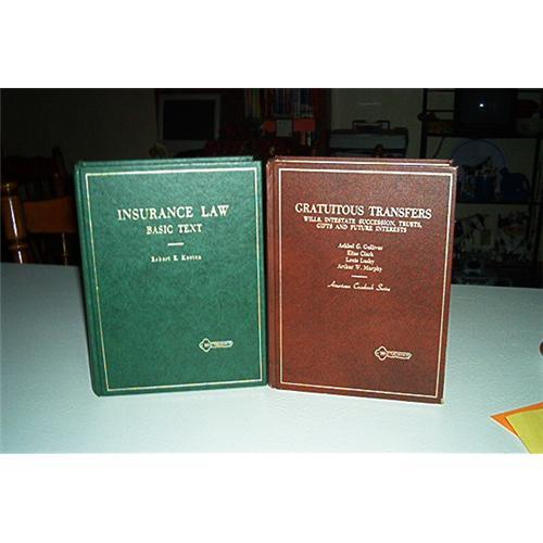 Two, large and thick Law Books. Insurance Law and Gratuitous Transfers. (1). Basic Text On Insurance Law by Robert E. Keaton-Professor Of Law, Harvard Law School. Published by Wert Publishing Co., St. Paul, Minn. C. 1978. 712 pages. 5th Reprint. (2). Gratuitous Transfers-Wills, Intestate Succession-Trusts- Gifts and Future Interests, by Ashbel G. Gulliver, Elias Clark, Louis Lusky and Artho W Murphy. American Case Book Series. Published by West Publishing Company, St. Paul, Minnesota. C. 1967-1017 pages. Both books are in excellent condition.