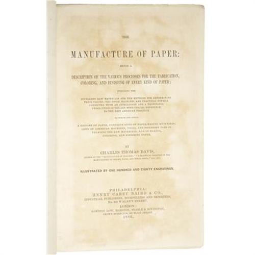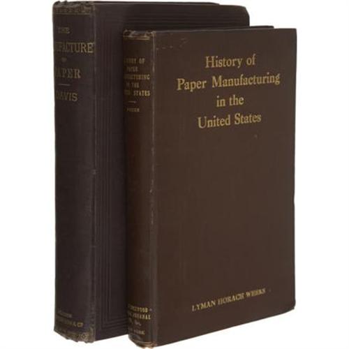 <B>Two Books on the Manufacture of Paper,</B></I> including:<BR><B>Lyman Horace Weeks: <I>A History of Paper-Manufacturing in the United States (1690 - 1916)</B></I></B></I> (New York: The Lockwood Trade Journal, 1916), first edition, 352 pages, brown cloth with gilt lettering on the spine and front board, 8vo (5.75" x 9"), no dust jacket. Good condition.<BR><B>Charles Thomas Davis: <I>The Manufacture of Paper:</B></I></B></I> <I>Being a Description of the Various Processes for the Fabrication, Coloring, and Finishing of Every Kind of Paper</B></I> (Philadelphia: Henry Carey Baird & Co., 1886), first edition, 608 pages, 8vo (6.25" x 9.5"), no dust jacket. Good condition.<BR><BR><b>Shipping:</b> Books & Catalogs (<a target="_blank" href="http://www.heritageauctions.com/common/shipping.php">view shipping information</a>)