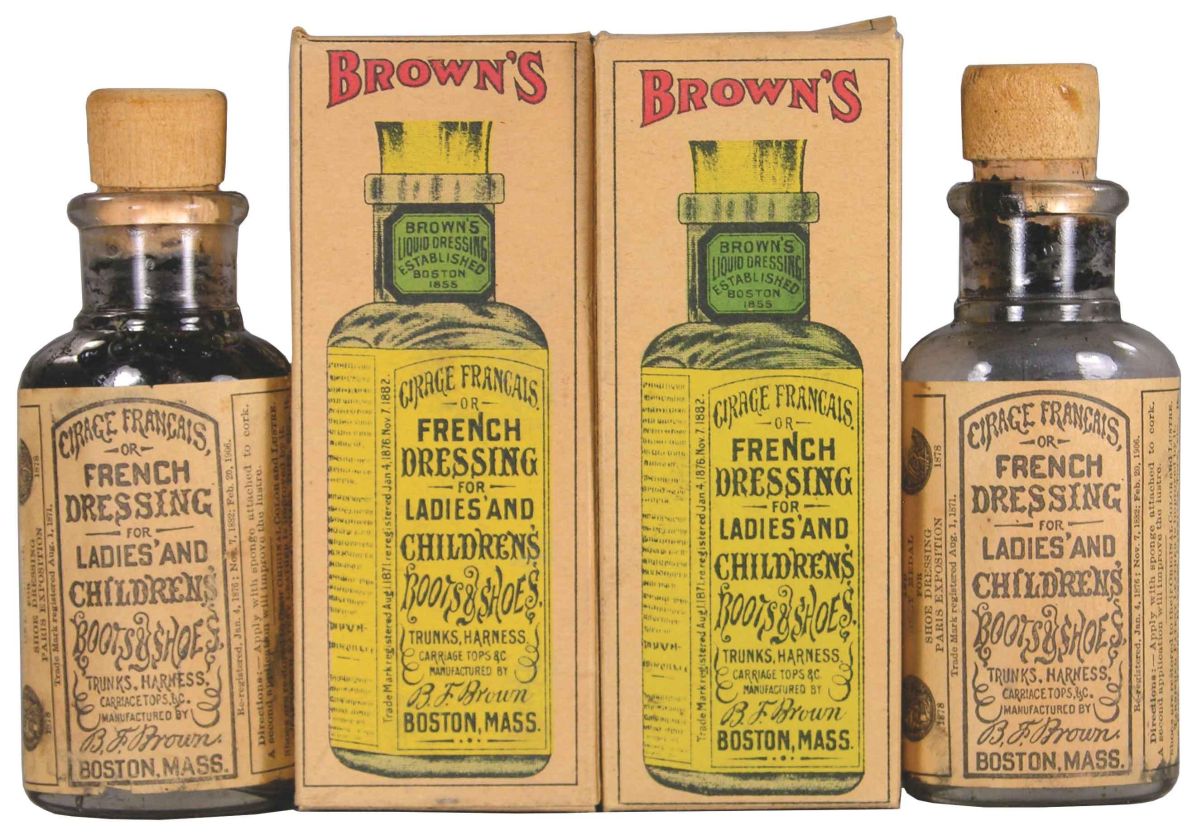 Two Bottles of Brown's French Dressing for Ladies and Childrens boots and shoes, in original boxes. Very good condition. 5 1/4 inches tall. Start Price $20