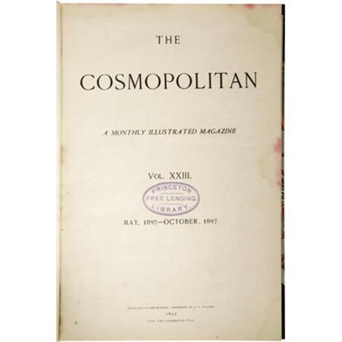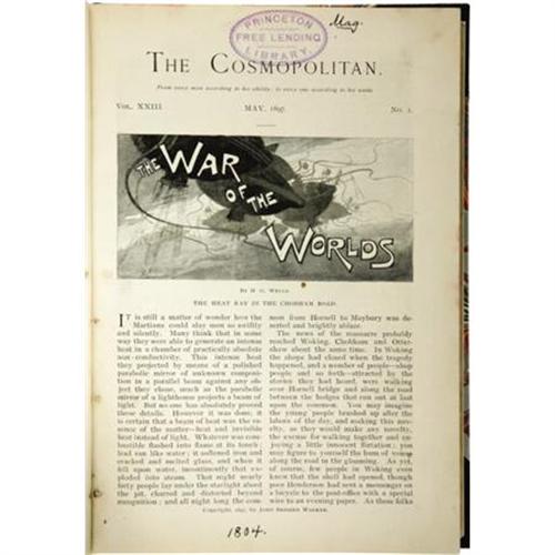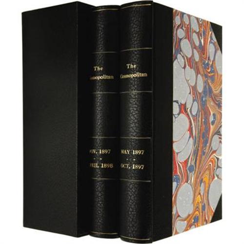 <B>Two Bound Volumes of </B></I><B><I>The Cosmopolitan Magazine</B></I></B></I><B> With a Near Complete Serialization of H. G. Wells’ </B></I><B><I>The War of the Worlds</B></I></B></I>. This marks the first appearance of the serialized version of the story (which pre-dated the hardcover edition) and was simultaneously published in England in <I>Pearson’s</B></I> magazine. At the time <I>The Cosmopolitan</B></I> bore little resemblance to the iconic women's magazine it has become. Started in 1886 as a "first class" family magazine, it featured articles on fashion, management of children, and under the editorship of John Brisben Walker, it became a leading market for fiction. These volumes ranging from May, 1897 through April, 1898 only lack the first 5 chapters of the total 22 chapters of H. G. Wells classic “it came from outer space” novella complete with illustrations by Cosmo Rowe and Warwick Goble. Each volume is uniformly bound in a modern half leather binding with marbled boards, gilt spine labels, 8vo (6.75” x 9.75”), the internal contents are bright, sound and in near fine condition. Each volume has a very small old library stamp on the title page. This attractive set is housed in a modern slip case.<BR><BR><b>Shipping:</b> Books & Catalogs (<a target="_blank" href="http://www.heritageauctions.com/common/shipping.php">view shipping information</a>)