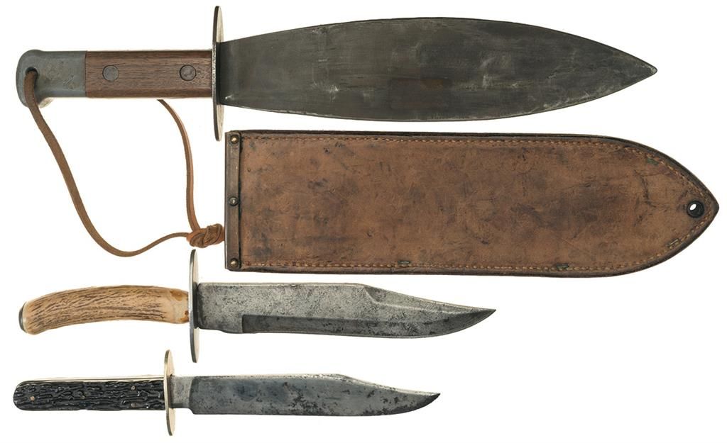 1) Unmarked Smatchet, 16" OAL, 11" leaf shaped blade, oval guard, wood and pewter grip, and leather thong. With a USMC/Boyt bolo sheath. 2) Unmarked bowie knife, 12 1/2" OAL, 7 3/4" blade, oval guard, stag grip. 3) L.F. & C. marked bowie, 11 3/8" OAL, 7" blade, German silver guard, and dark stag grip panels. Smatchet is good, bowies are fair.