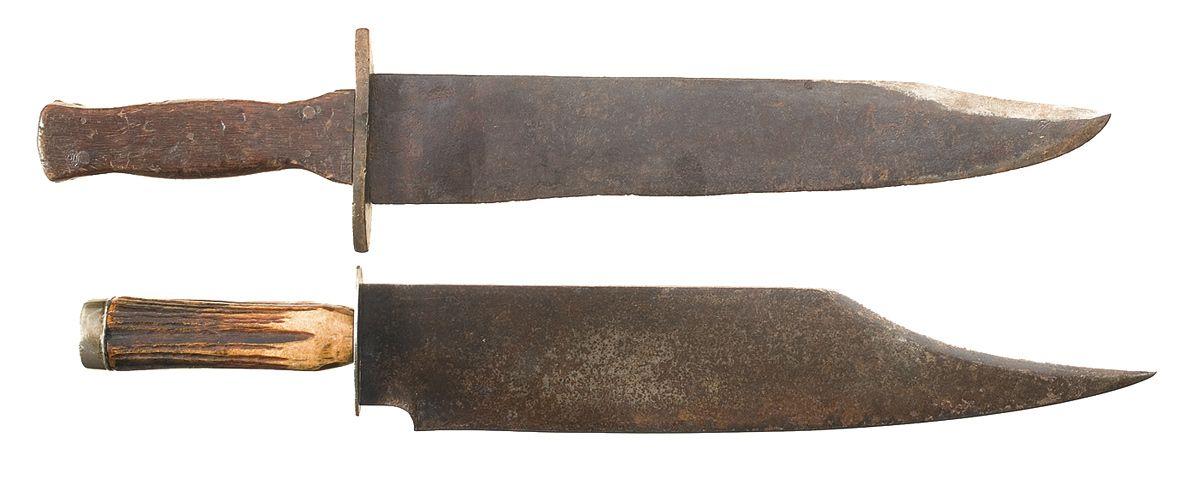 1) Unmarked, blacksmith produced bowie knife with wood grip (12" blade, good, some minor pitting). 2) "WOSTENHOLM / SHEFFIELD" and "I*X*L" marked bowie knife with stag grip (13" blade, even minor spotting).