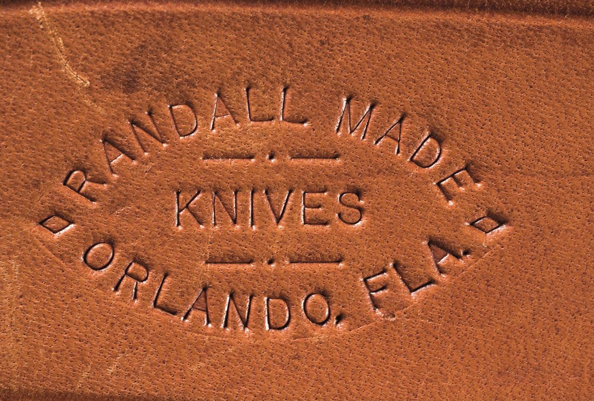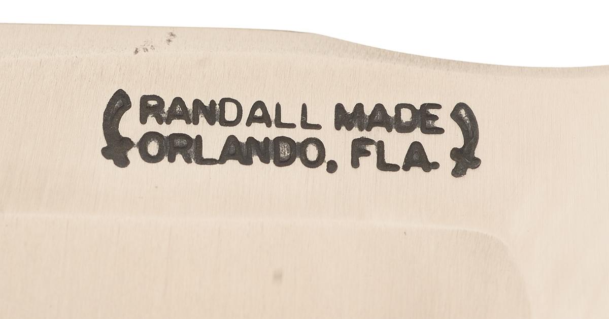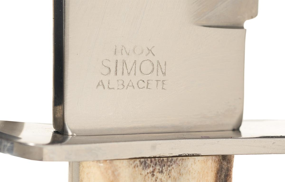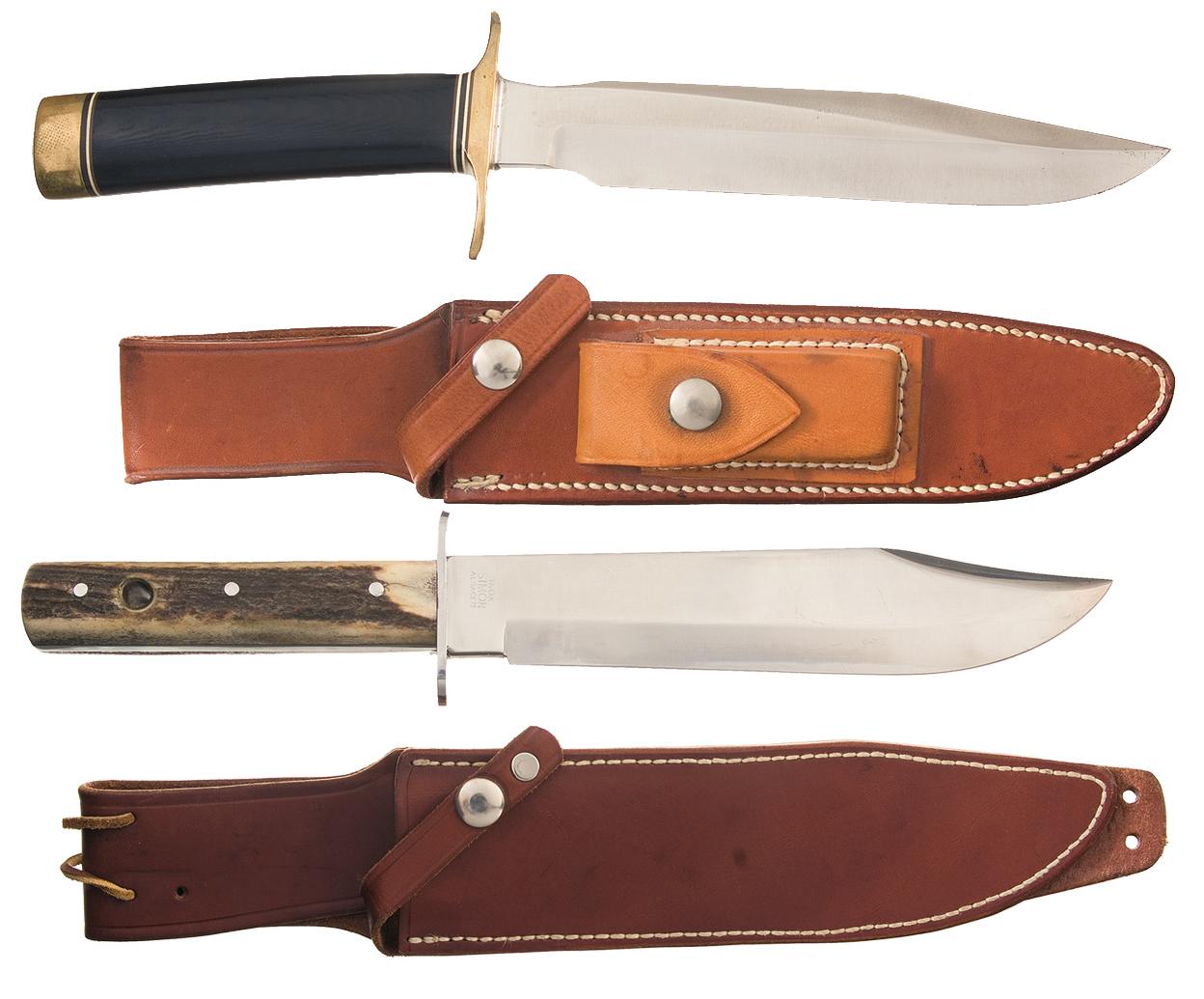 1) 1984 Randall bowie knife with a 7 inch blade marked with the scimitar flanked two line Randall Orlando address. The slightly turned down guard and pommel are brass. Micarta handle. OAL: 11 3/4". Complete with a brown leather sheath with the Randall address marking on the back of the belt loop with the number "7". Included is a sharpening stone. 2) Simon bowie knife with an 8 3/4 inch blade with "INOX / SIMON / ALBACETE" on left ricasso. Stag scales with lanyard hole. OAL: 13 7/8". Complete with brown leather Sullivans sheath.