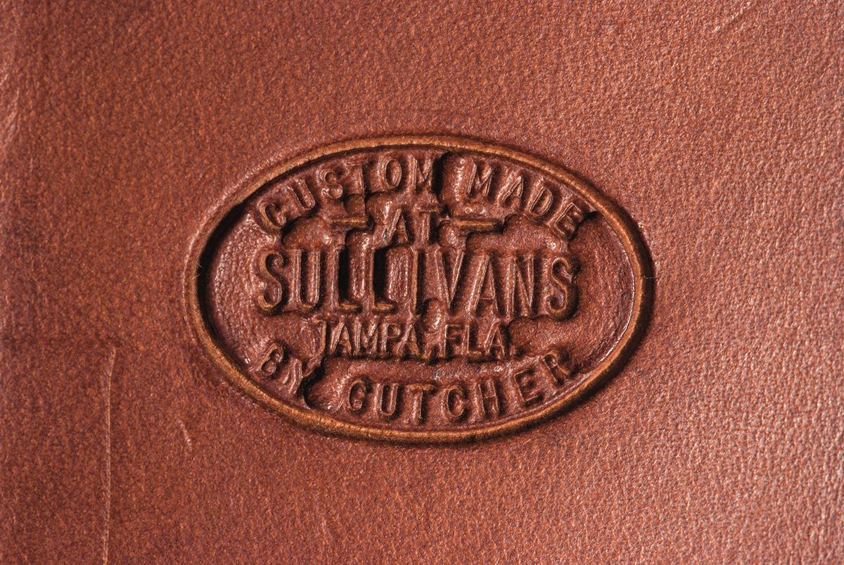 Condition: 1) Excellent, with some scattered mild scratches. The brass has a mixed aged patina. Overall excellent sheath. 2) Very good, with some minor scratches and some minor sharpening marks on the blade. The scales have a few hairline age cracks. Overall sheath is very good plus.