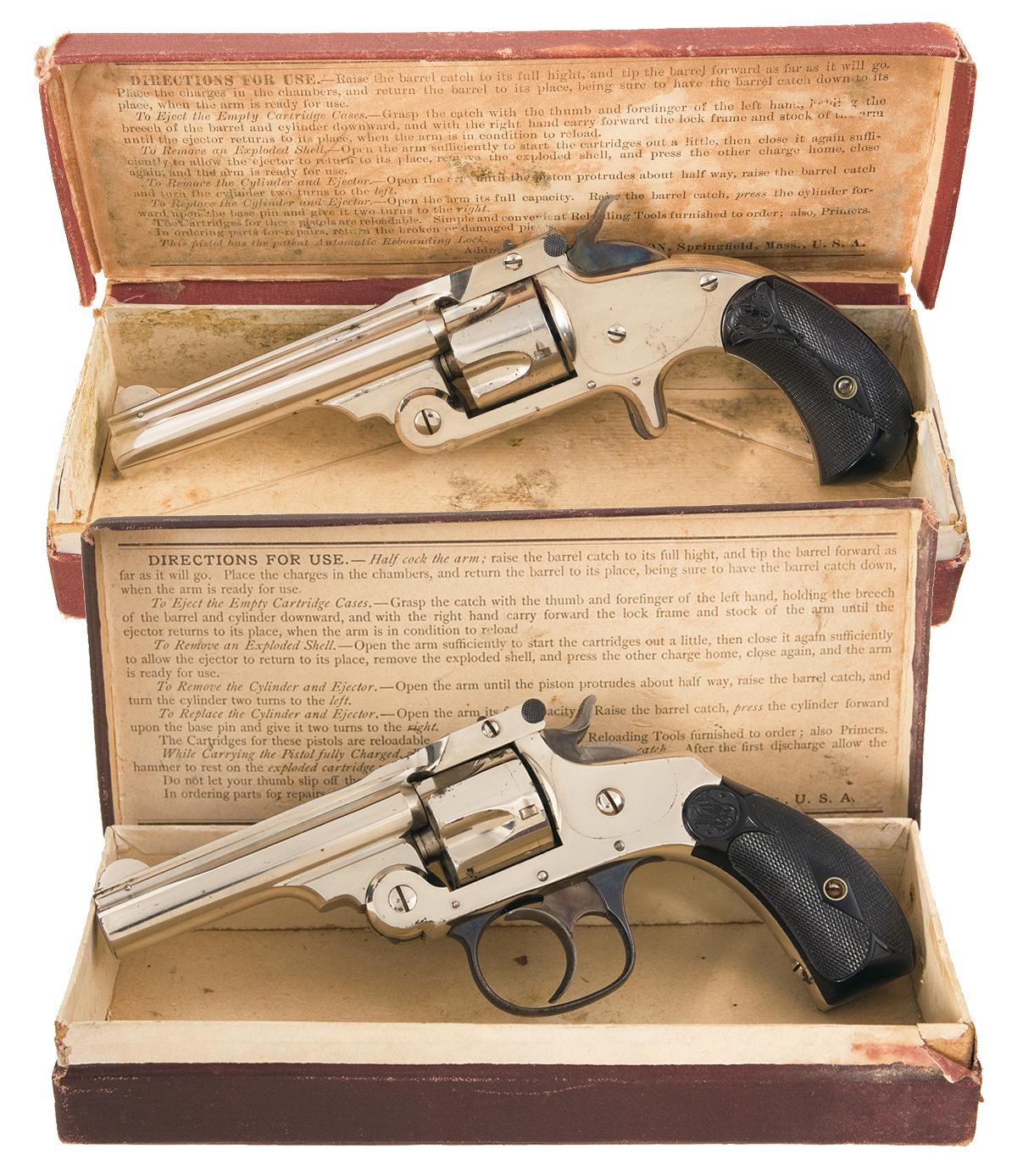 Manufactured from 1883 to 1909. Features a pinned half-moon front and notch rear sights, top break action and oval trigger guard. All nickel finish with casehardened trigger and hammer, and blue trigger guard and barrel latch. Fitted with black checkered hard rubber grips with "S&W" logo at the tops and patent marking on the lower left panel. Standard two line address/patent dates marked on top of the barrel rib. Matching serial number marked on the butt, rear cylinder face, barrel and on the barrel latch. Complete in a maroon hinged lid box with correct end label and "Directions For Use" label on the inside of the lid.
