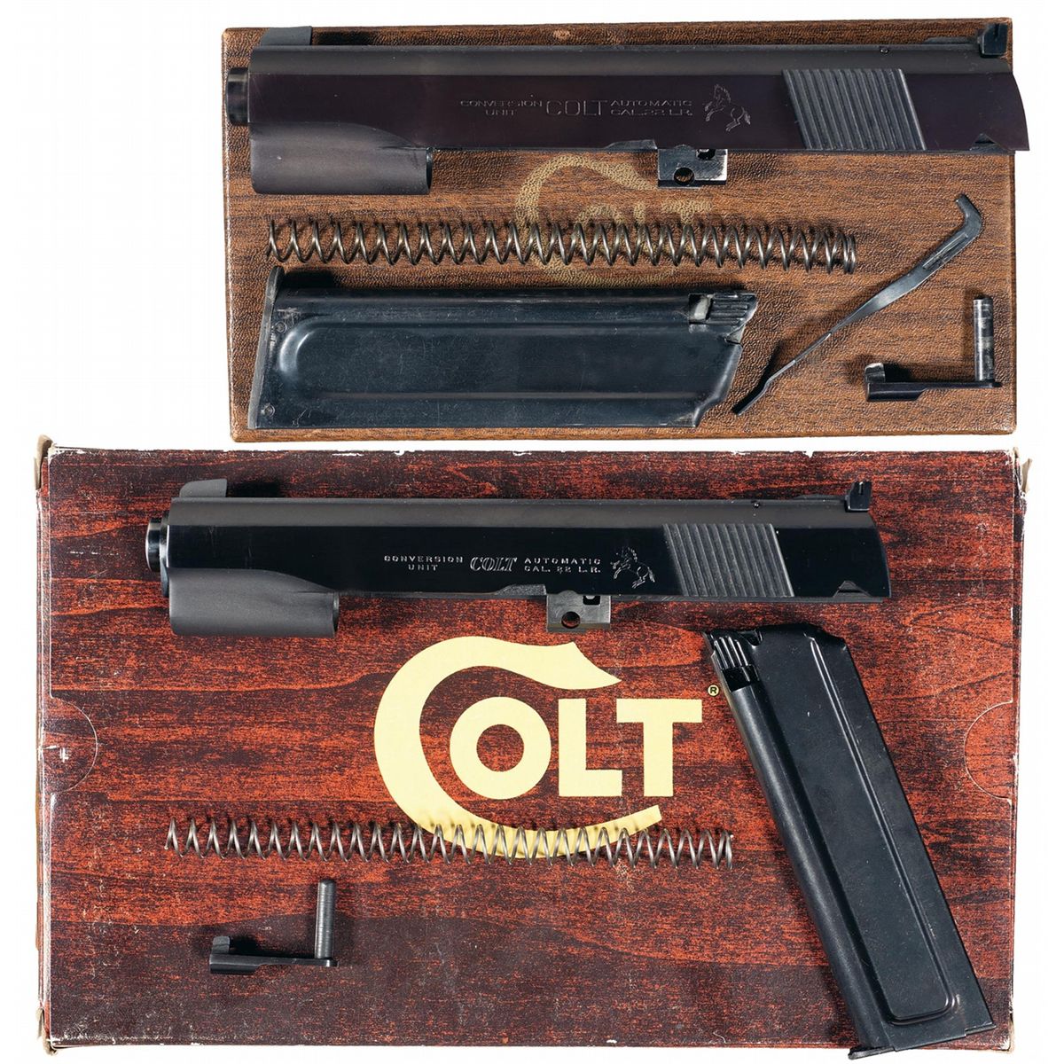 1 Colt 22 LR Conversion Kit for the 1911 Pistol with Colt "wood grained" two piece box and correct label. 1 Colt 22 LR Conversion Kit for 1911 Pistol with Colt foam and "wood grain" box. Both with standard conversion slide markings, fixed front and adjustable rear sights. The kits include the slide, recoil spring, barrel, magazine and slide stop.