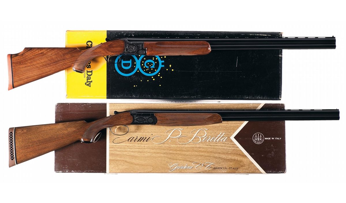 - B) Manufactured between 1968 and 1976 and marketed by Garcia Sporting Arms. Silver front and mid barrel bead sights. 3 inch chambers, choked full/modified with ejectors. Standard markings. Fitted with a deluxe walnut checkered forearm and checkered pistol grip stock with a " White Line" Pachmayr vented recoil pad. Complete with original box numbered to the gun.
