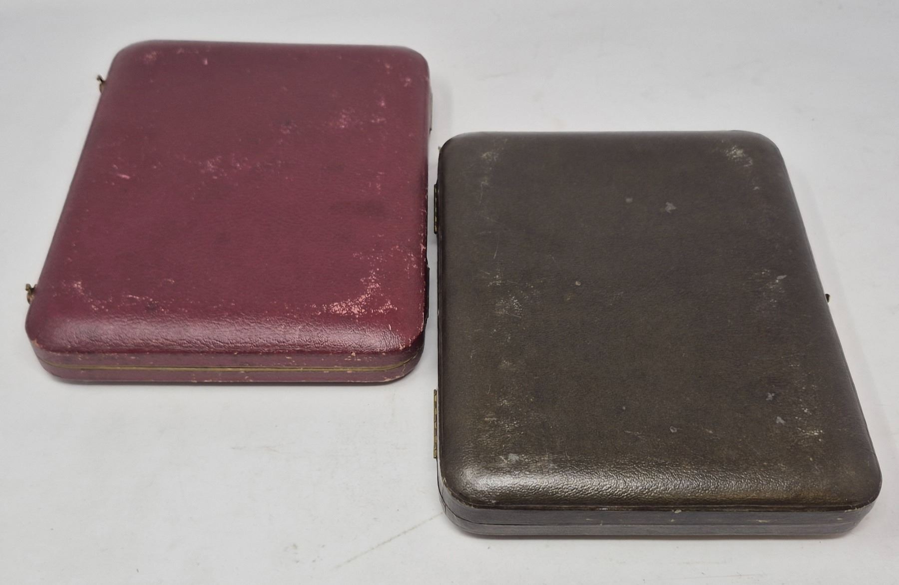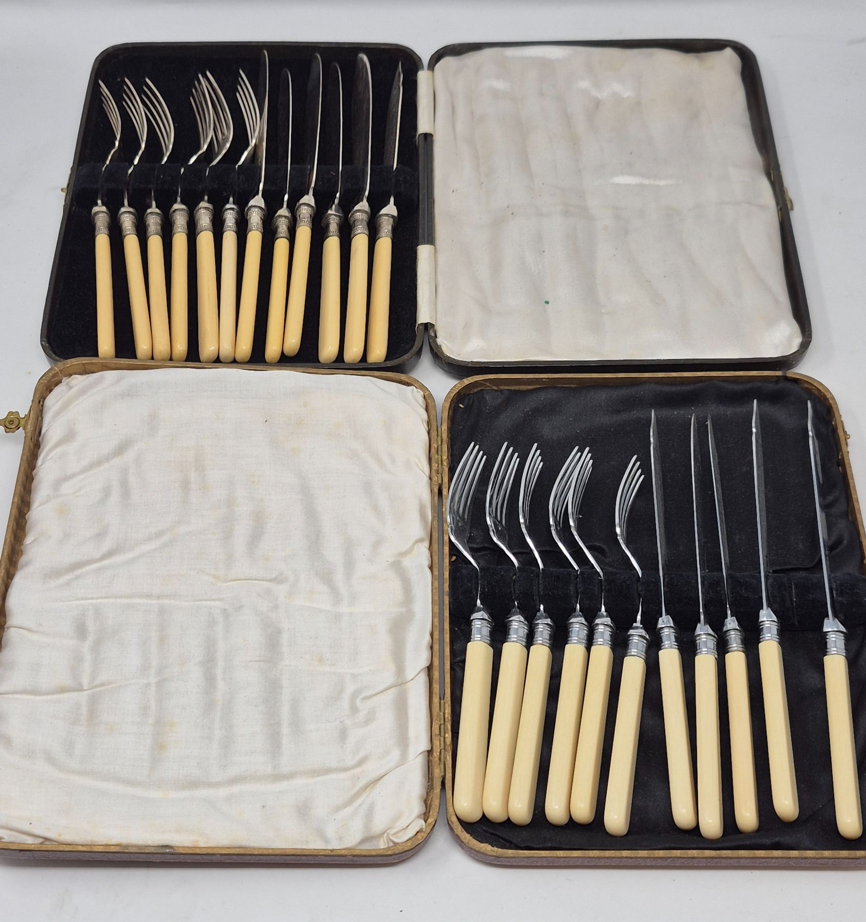 Cased flatware sets featuring faux ivory handles and silver-tone fittings. Likely early to mid 20th century; includes matched forks and knives for meat or fish service.