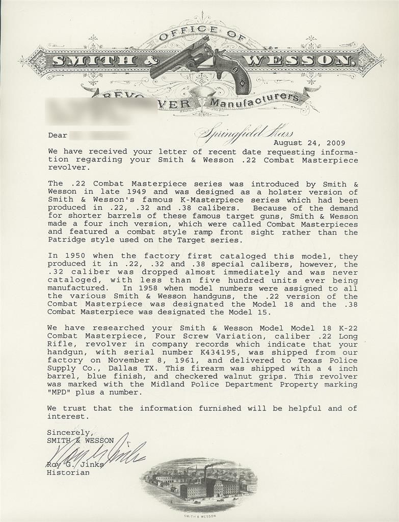 A) With box numbered to another gun and factory letter that confirms barrel length, Midland Police Department property marking and grips with blue finish at time of shipment to Texas Police Supply Col., Dallas, TX on Nov. 8, 1961.