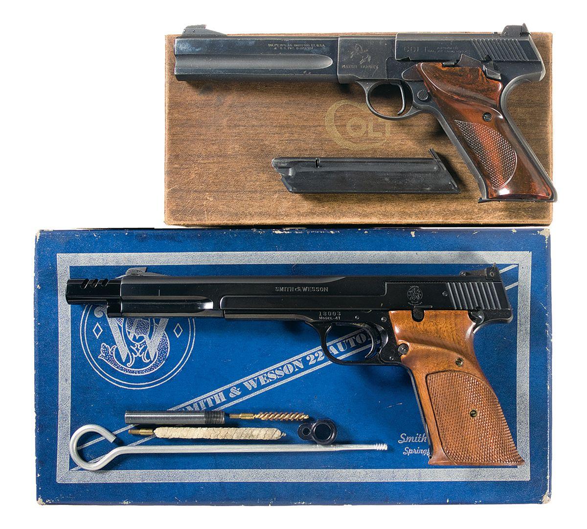 A) Made in 1949. Standard markings and features. With woodgrain box numbered to another gun and extra magazine.