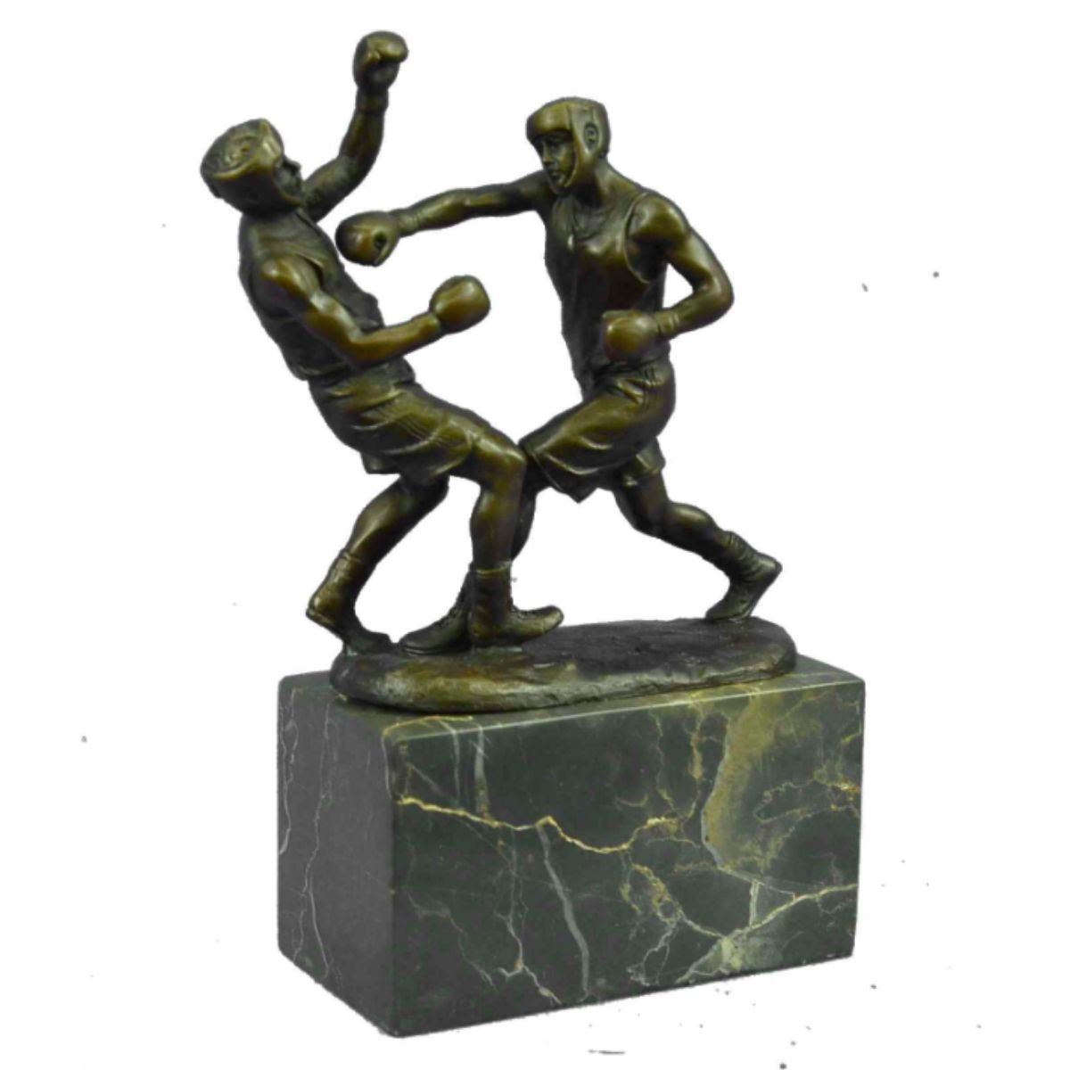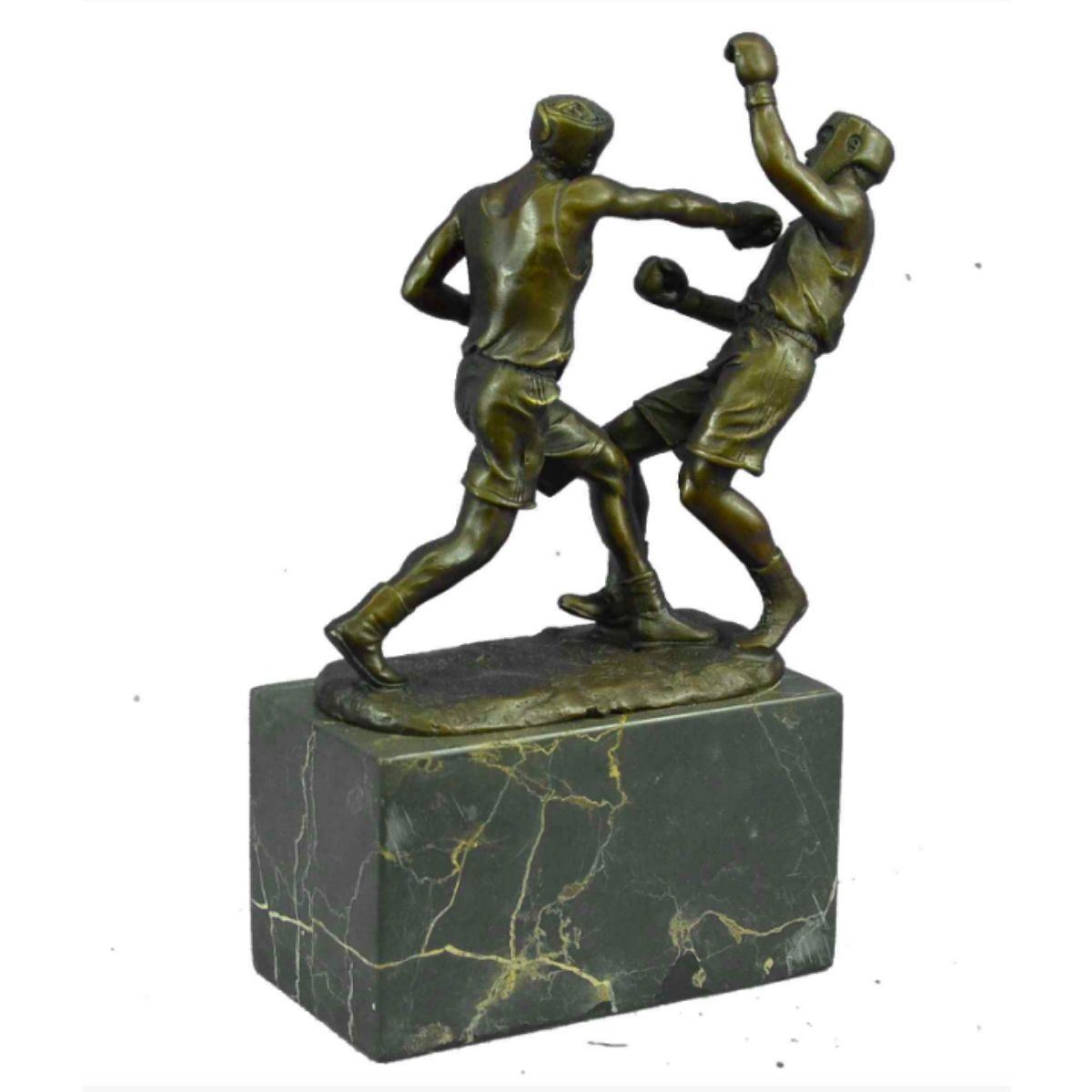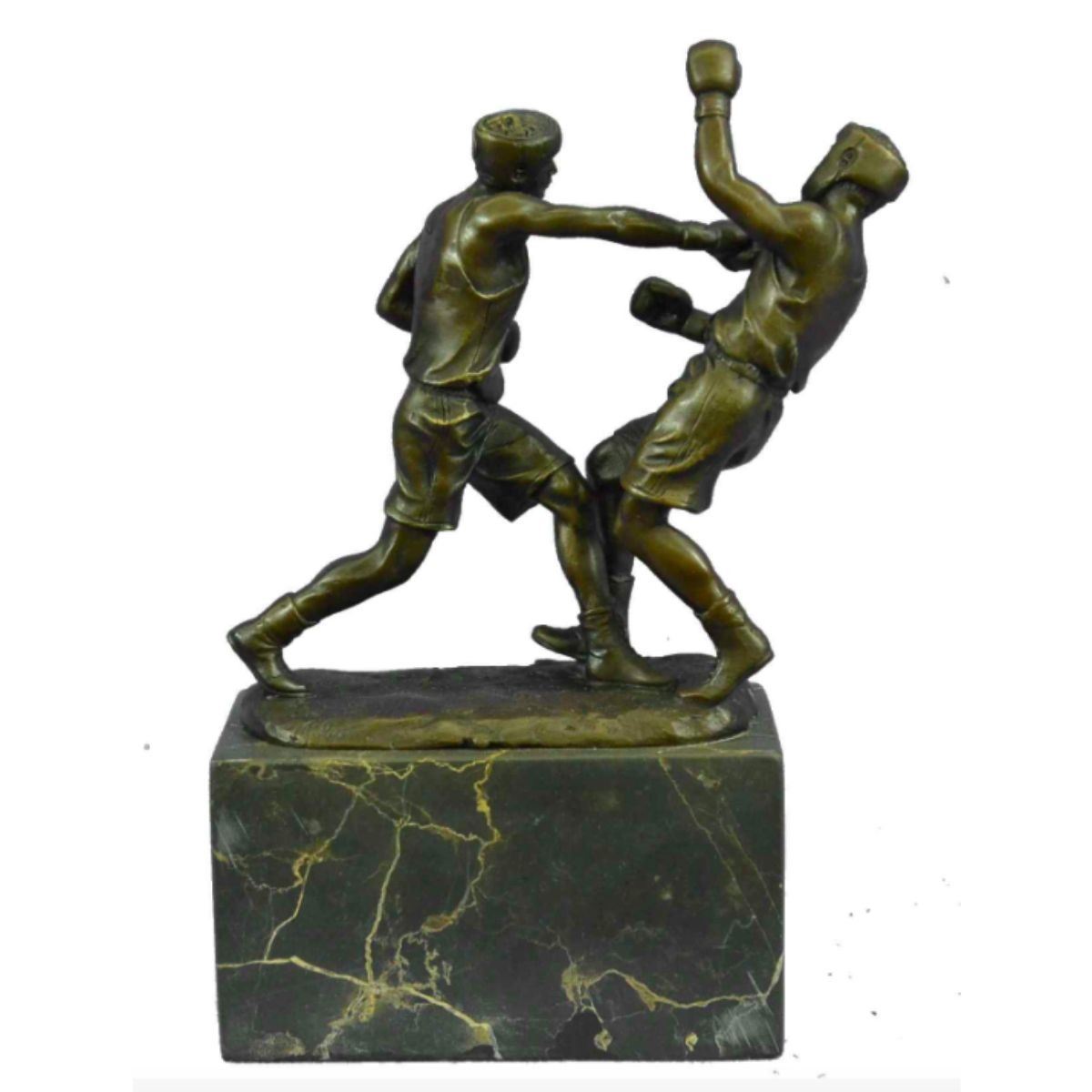 Two Boxers, boxing gym sculpture, boxing trophy. Lost wax casting method bronze, with brown patina, mounted on a marble base. 9" H X 5" W. 9lbs. Signed by artist, Milo.