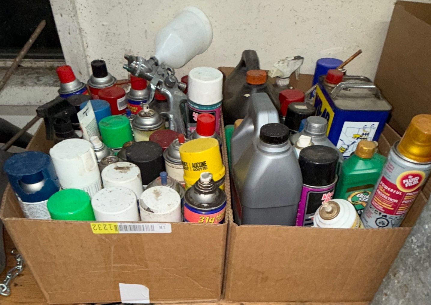 Two Boxes of Shop Fluids-- WD40, Lubricants, Grease, Transmission Fluids, Oil & More