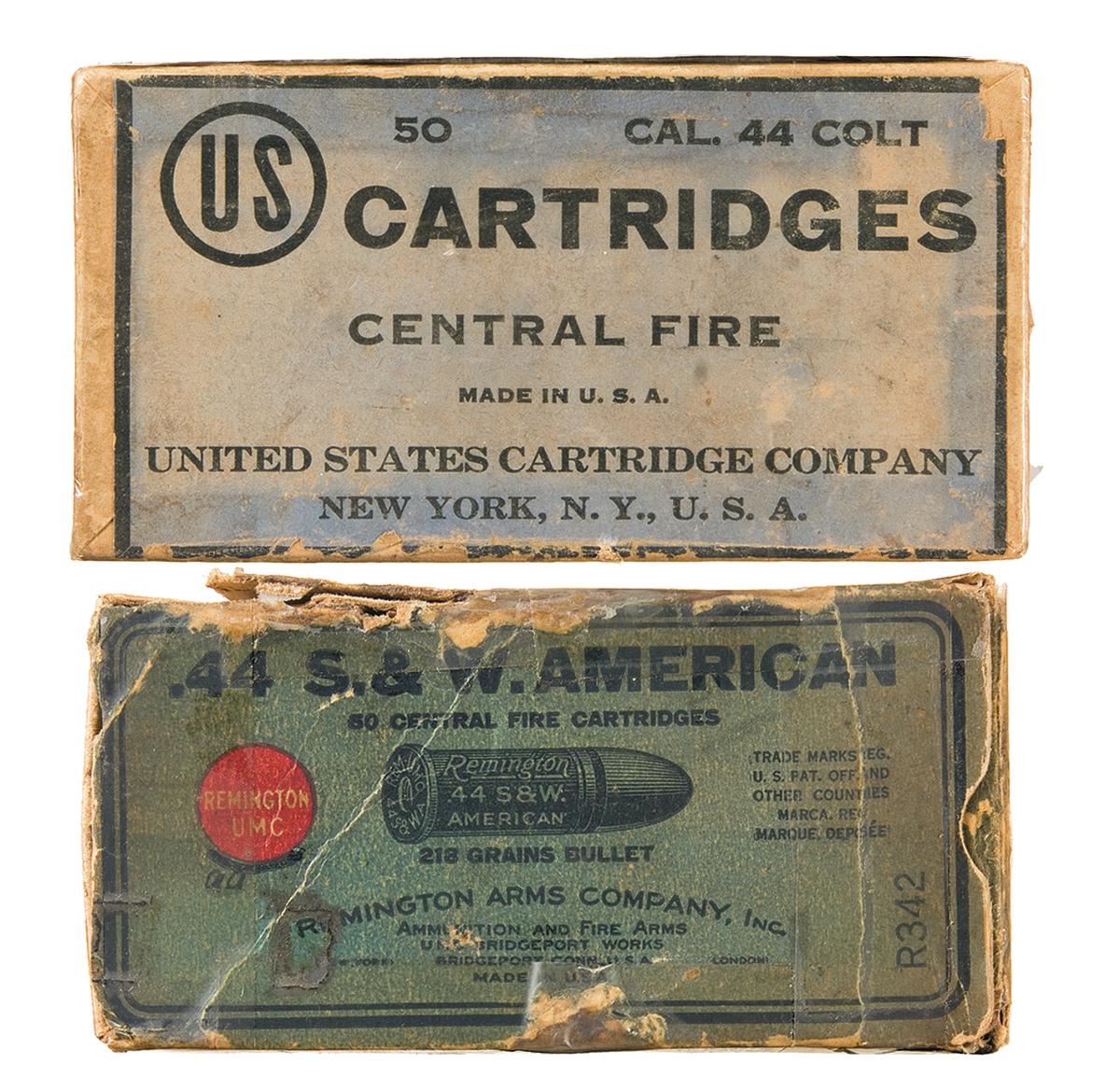 1) Box of fifty United Stated Cartridge Company .44 caliber cartridges labeled " CAL. 44 COLT/RIFLE CARTRIDGES/ CENTRAL FIRE". Box top and sides have a blue label with caliber and maker information. A typed label on the outside of the protective wrapping states that these cartridges will only fit Colt M1860 conversions. 2) Box of fifty Remington-UMC .44 S&W American cartridges. Box top and sides have the correct green label with caliber and maker information. The bottom of the box as the guarantee label, with "J13D" period stamped in purple ink.