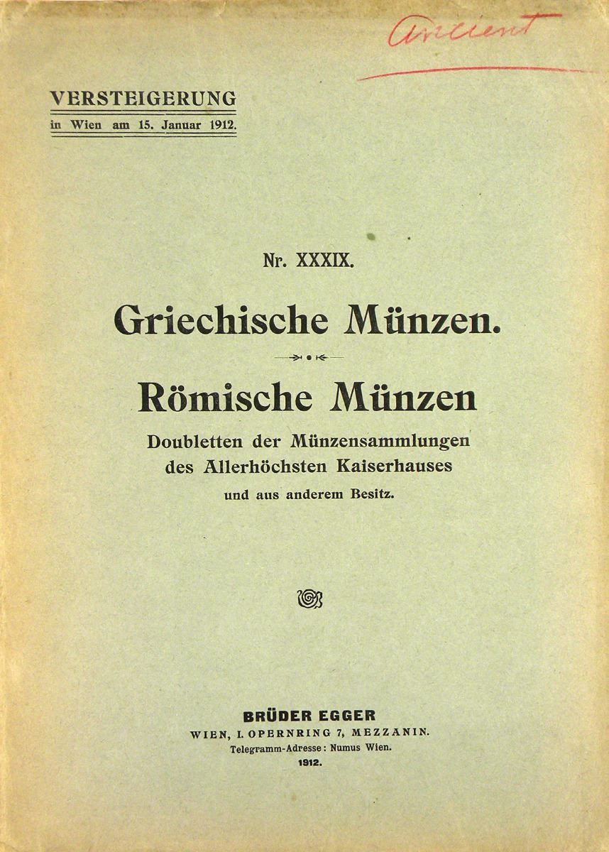 Egger, Brüder. GRIECHISCHE MÜNZEN. RÖMISCHE MÜNZEN. DOUBLETTEN DER MÜNZENSAMMLUNGEN DES ALLERHÖCHSTEN KAISERHAUSES UND AUS ANDEREM BESITZ. Wien, 15. Januar 1912 und folgende Tage. 85, (1) pages; 1587 lots; 32 fine plates. [with] Egger, Brüder. RÖMISCHE MÜNZEN. SAMMLUNG EINES BEKANNTEN WIENER AMATEURS. Wien, 14. April 1913 und folgende Tage. 91, (1) pages; 2046 lots; 32 fine plates of ancient Roman coins. Both 4to, original printed card covers. Bindings a little worn; very good or better. Two scarce and important sales primarily important for Roman coins. See catalogue for full description.