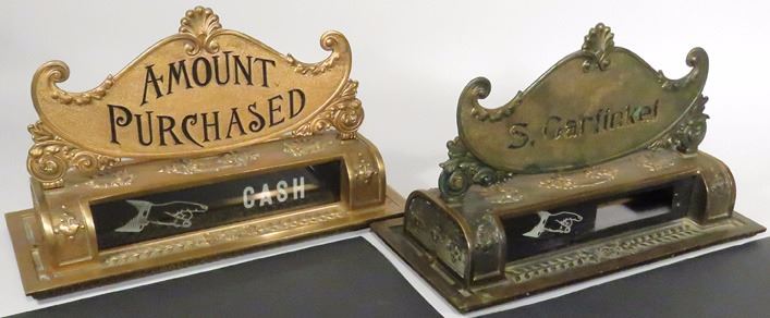 Two Brass Cash Register Top Signs on register heads. "Amount Purchased" and Personalized "S. Gariinkel" (glass missing) are stamped 433K on underside. 13 X 5 3/4 inches.